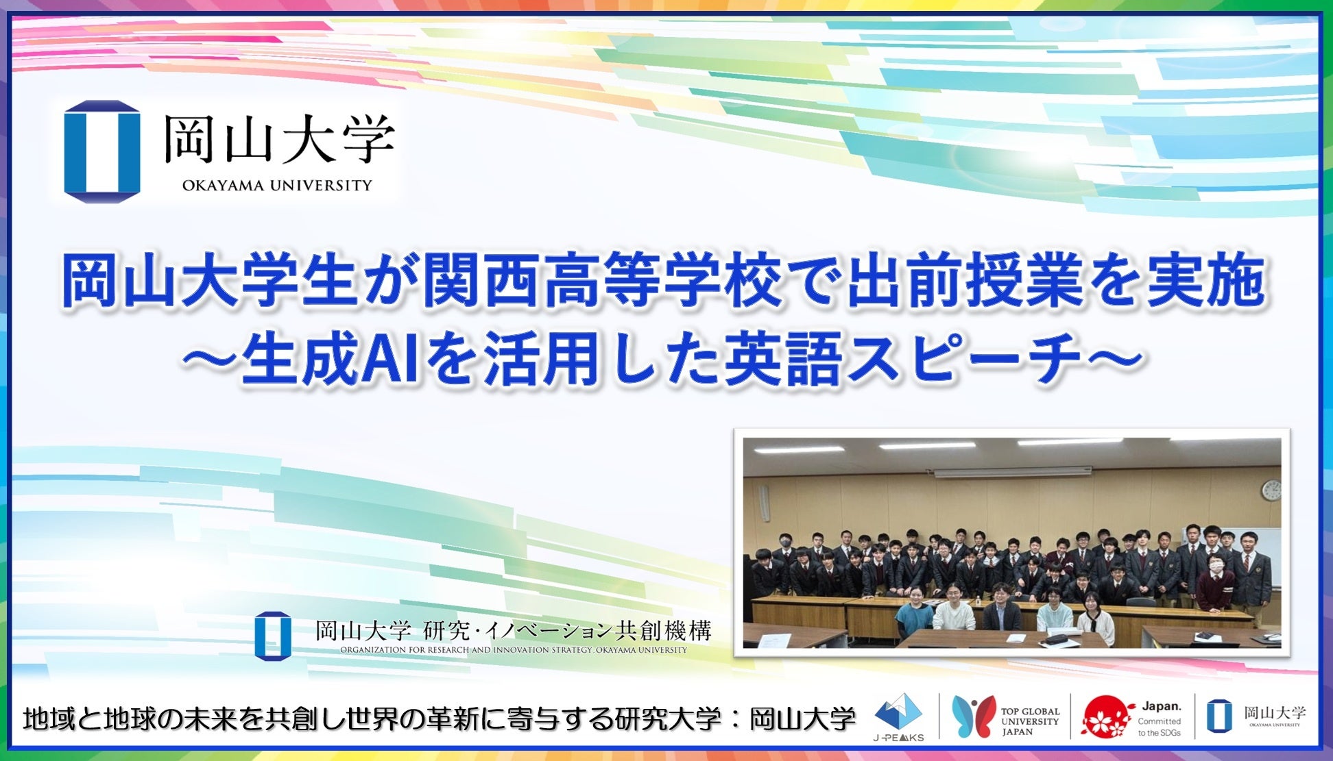 国立大学法人岡山大学(本部:岡山市北区、学長:那須保友)の研究・イノベーション共創機構は2026年1月29日、関西高等学校にて、生成AIを活用した英語スピーチをテーマとする出前授業を実施しました。本事業は、国立研究開発法人科学技術振興機構(JST)「EDGE-PRIME Initiative」事業の一環として行ったもので、倉敷青陵高等学校、岡山学芸館高等学校に続き、3回目となります。