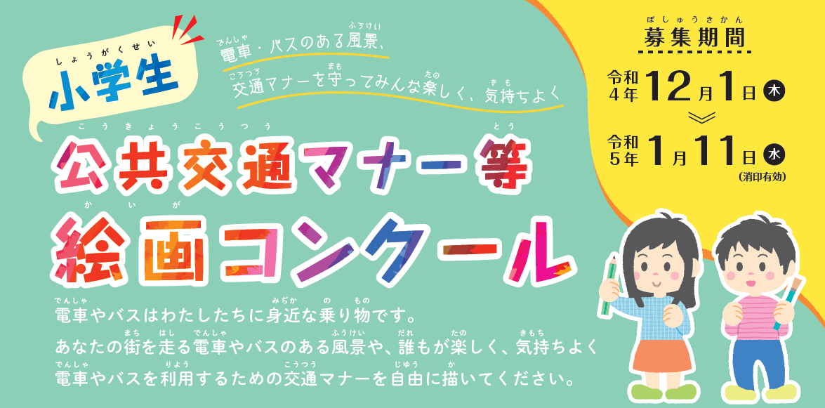 東京都交通局では、昨年度に引き続き、小学生のお子様を対象に、誰もが楽しく、気持ちよく公共交通を利用するためのマナーについて考える機会とするとともに、公共交通について愛着や親しみを感じてもらうことを目的として、絵画コンクールを実施します。多数のご応募をお待ちしております。