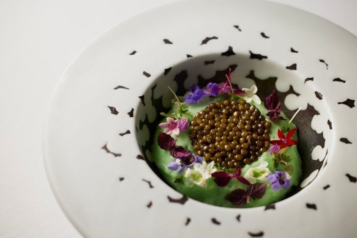 前菜には、ブッシュ・ド・ノエルを模したパテ・アンクルートを。メインには、じっくりと火入れした和牛に炭の香りをまとわせ、深みのある味わいに仕上げました。デザートは、レストランに飾られたアートからインスピレーションを得て、視覚と味覚の両面で楽しめる一品に。