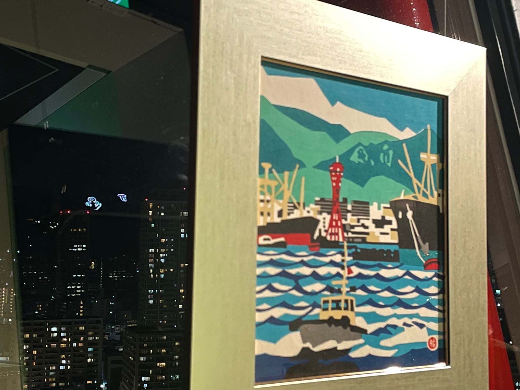 「神戸ポートタワー」今の風景と作品を重ねて観られます。作中の、あのころと今の“神戸港旧信号所(旧新港第5突堤信号所)”を一緒に望む。