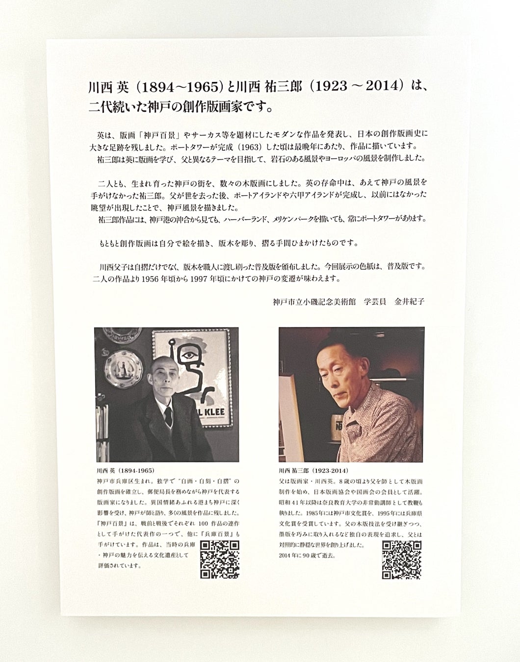 親子で神戸の風景を表現する作家となった英と祐三郎。神戸にそんな親子版画家が居たこと、魂をこめて刷り上げた作品の数々を、忘れて欲しくないと思うようになりました。家族でもあり先人の川西英・祐三郎の版画で社会のお役に立てるのではないかと一念発起し、「神戸百景」を屋号とし、神戸の魅力を発信・企画しております。街の色と文化の継承、人が持つ表現力と可能性を祈念しこの活動を通し社会貢献して参ります。『神戸百景』代表 川西 和代