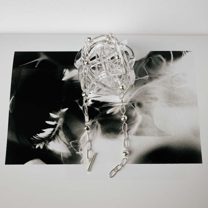 表面が凸凹なボールが一番のポイントのネックレス。バーを通す位置を変えると長さ調整が可能なので、短くチョーカーのように着用していただくのもオススメです。