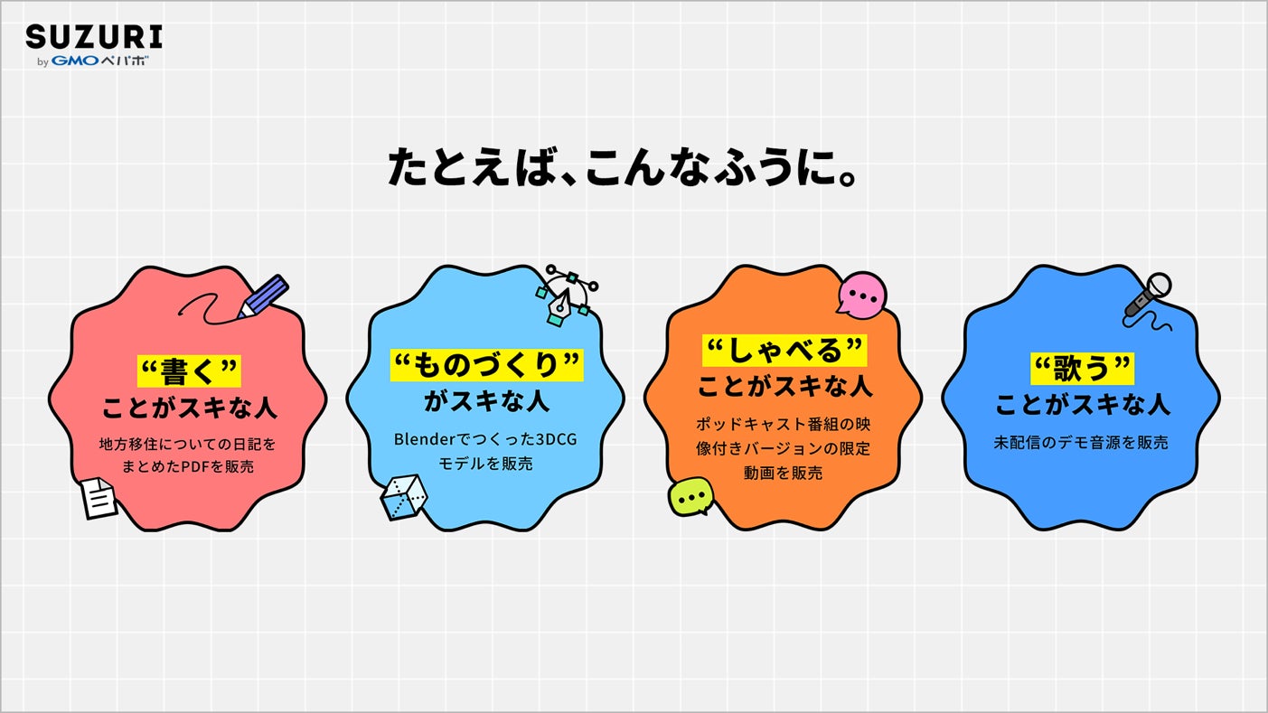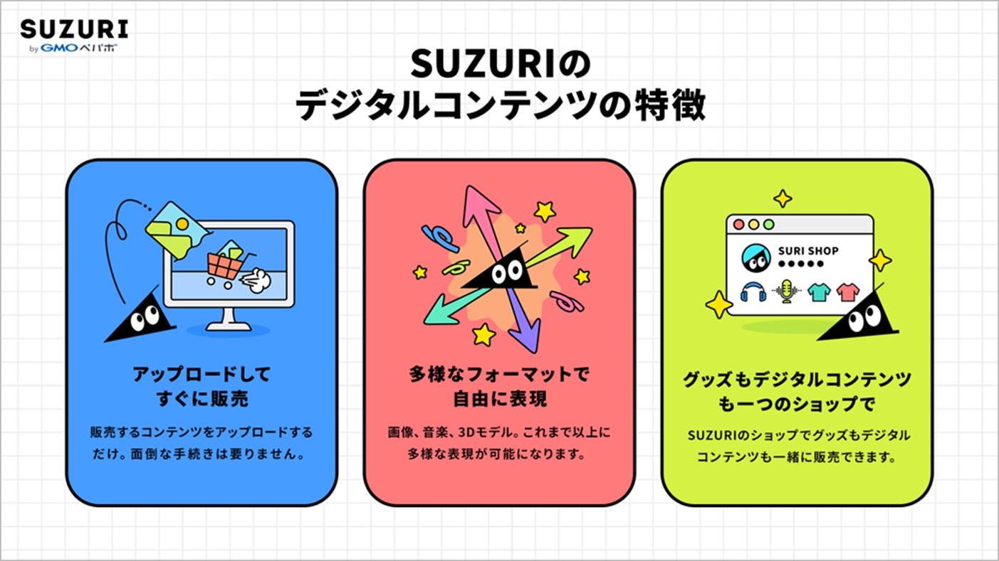 このたび「SUZURI byGMOペパボ」では、デジタルコンテンツの取り扱いを開始し、領域を拡大することで、クリエイターには新たな創作活動の場を、ユーザーに新たなコンテンツとの出会いを創出、提供いたします。