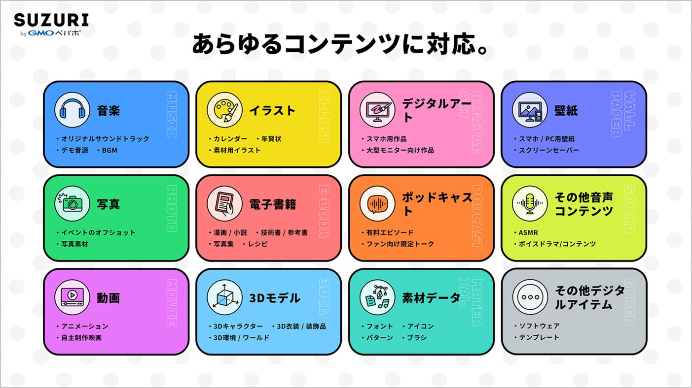 「SUZURI byGMOペパボ」のデジタルコンテンツ販売では、11カテゴリを用意し、イラスト、動画、音楽、3Dモデル、音声ファイルなどのあらゆるデジタルコンテンツに対応します。これにより、イラストレーター、音楽・動画クリエイター、写真家など、多様なクリエイターに新たな活躍の場を創出します。