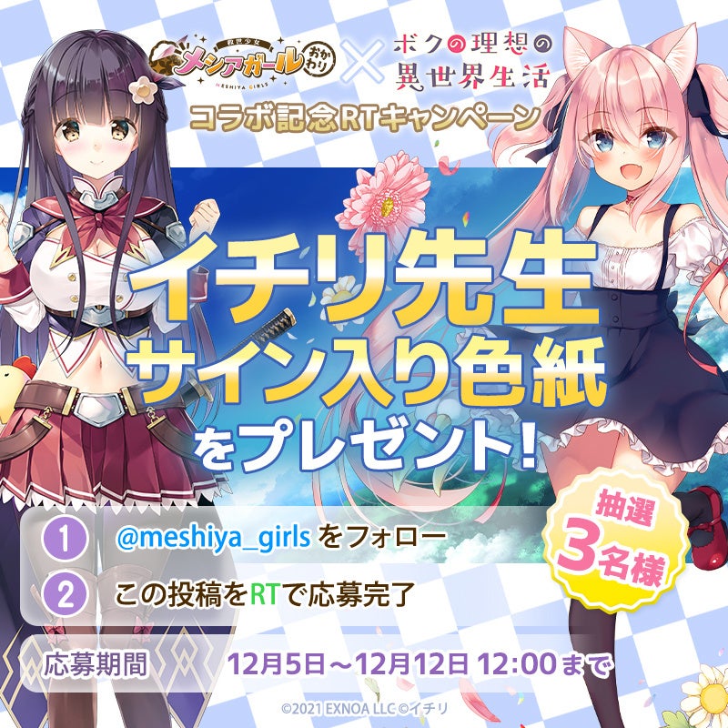 「ボクの理想の異世界生活」とのコラボを記念してイチリ先生サイン入り色紙が抽選で3名様に当たる「ボクの理想の異世界生活コラボ記念リツイートキャンペーン」を実施いたします。
