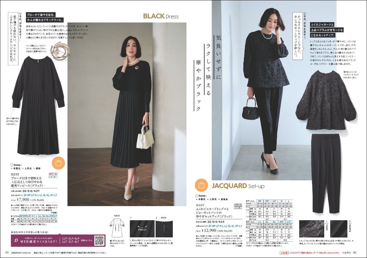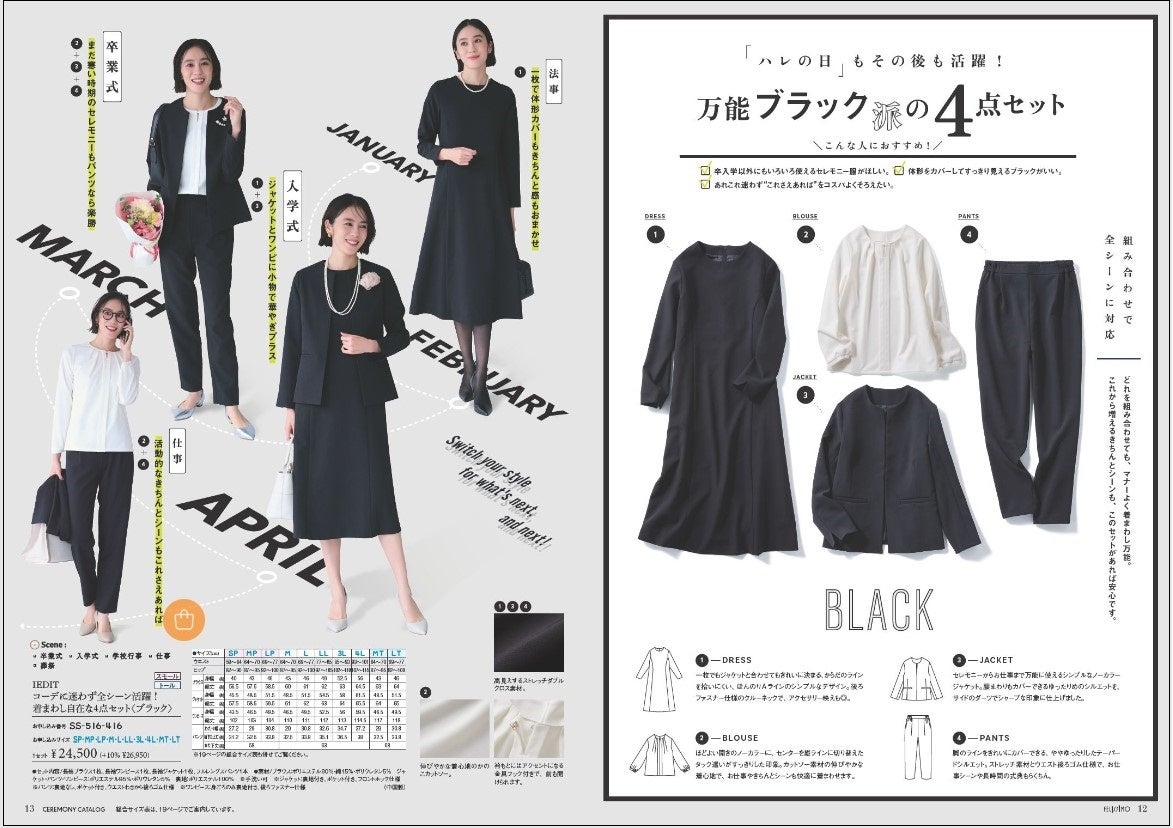 卒入学だけでなく、幅広いセレモニーシーンに対応できる万能セットです。体形をカバーしつつ、すっきりとしたブラックで品よく着こなせます。