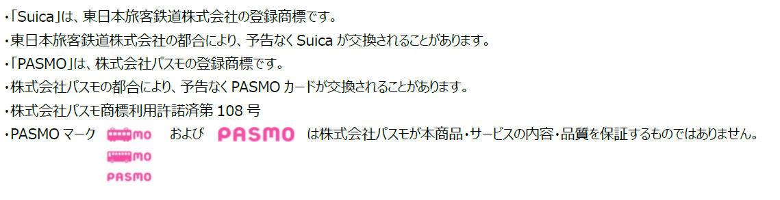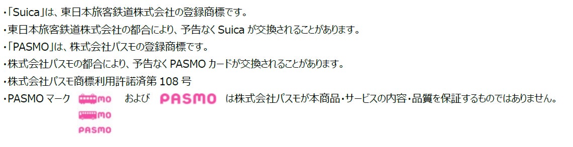 対象券面:「Suica」「PASMO」 ※無記名式の「Suica」「PASMO」およびモバイルSuicaはご利用になれません。