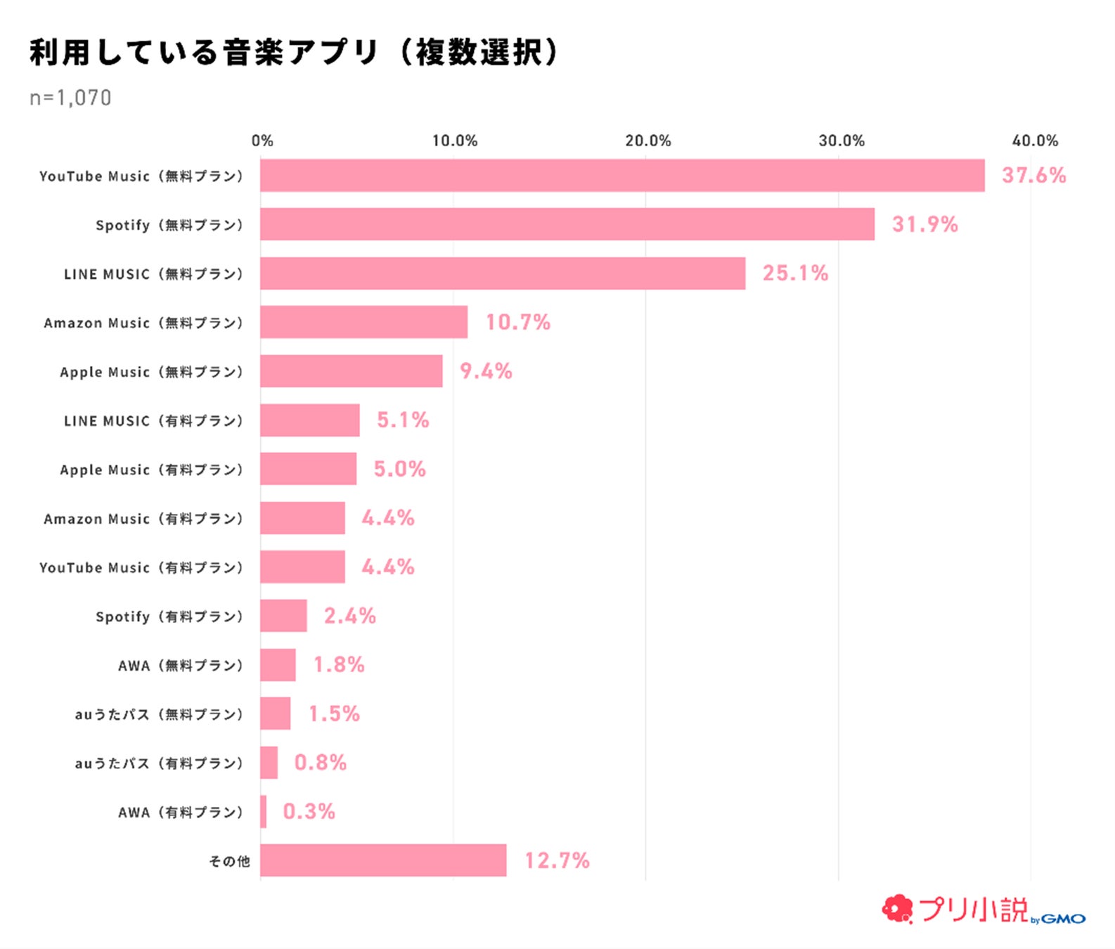 GMOインターネットグループのGMOメディア株式会社(代表取締役社長:森 輝幸 以下、GMOメディア)が運営するチャット型小説サービス「プリ小説 byGMO」(URL:https://novel.prcm.jp/)は、10代女子1,070人を対象に『音楽アプリに関する調査』を実施いたしました。