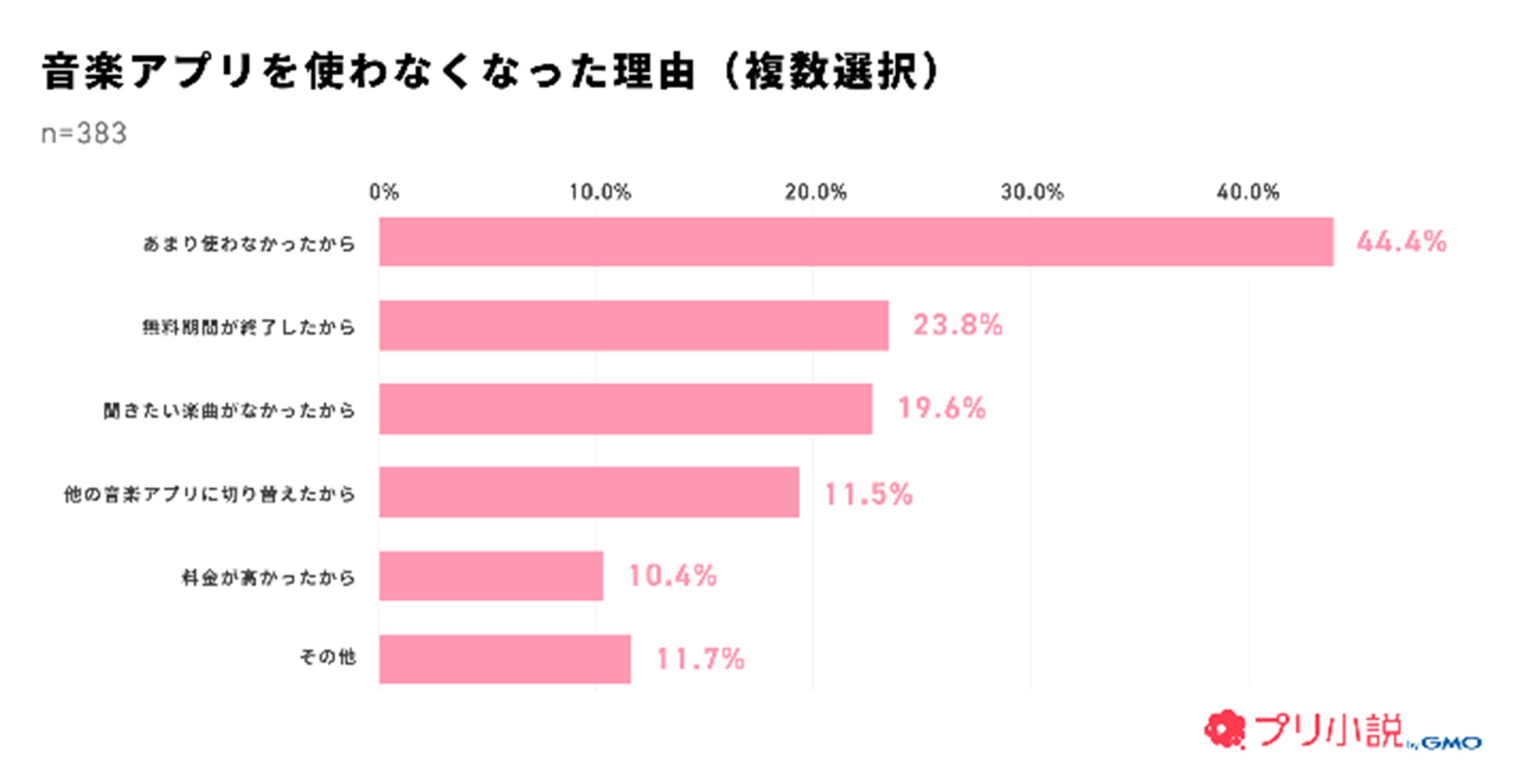 「音楽アプリを使わなくなった理由」については「あまり使わなかったから(44.4%)」との回答が4割超と多くを占め、「無料期間が終了したから(23.8%)」「聴きたい楽曲がなかったから(19.6%)」と続きました。
