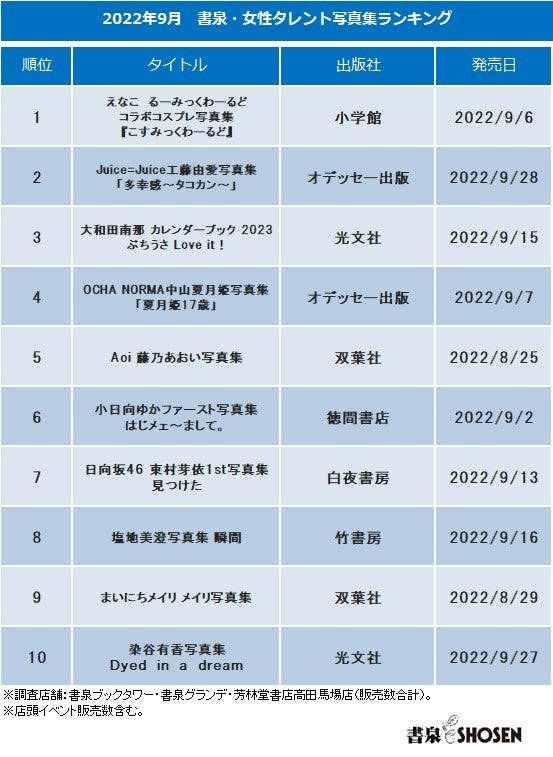 株式会社書泉(アニメイトグループ)は、「アイドルイベントの聖地」と呼ばれる書泉ブックタワー含む書泉店舗においての2022年9月の「女性タレント写真集売上ランキング」を発表いたします。