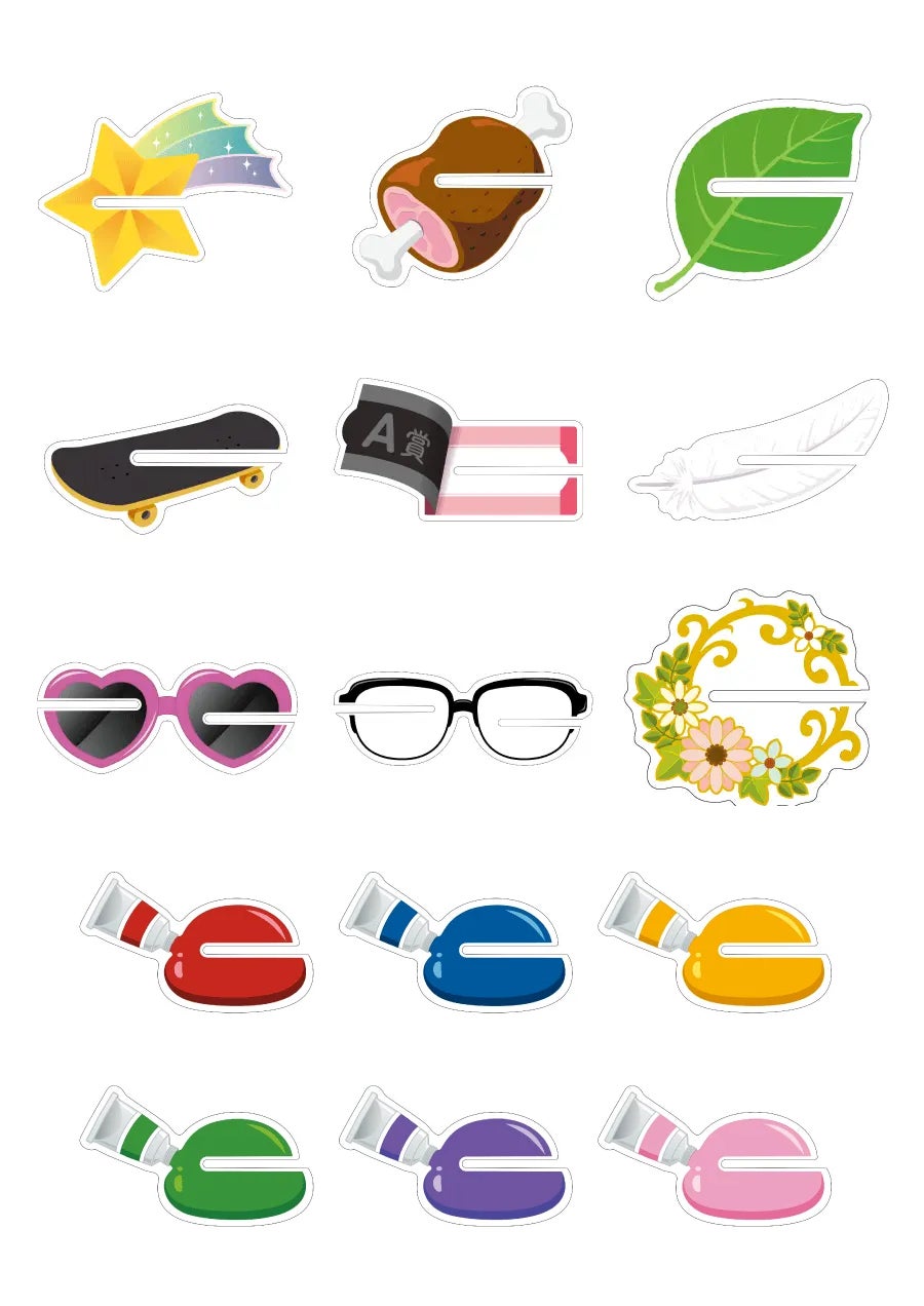 サングラス/めがね/流れ星/骨付き肉/花冠/くじ券/葉っぱ/鳥の羽/スケボー/絵具 全6色