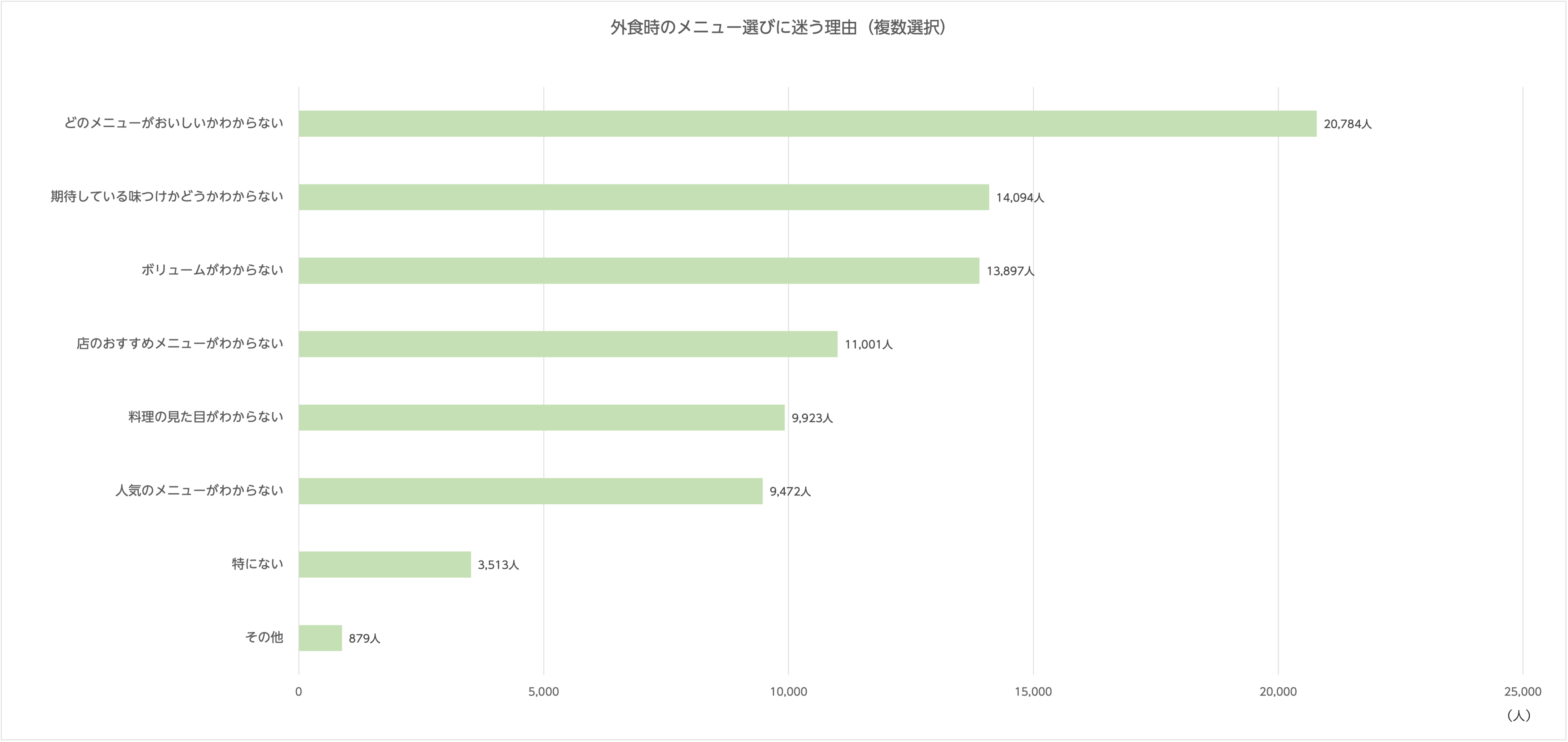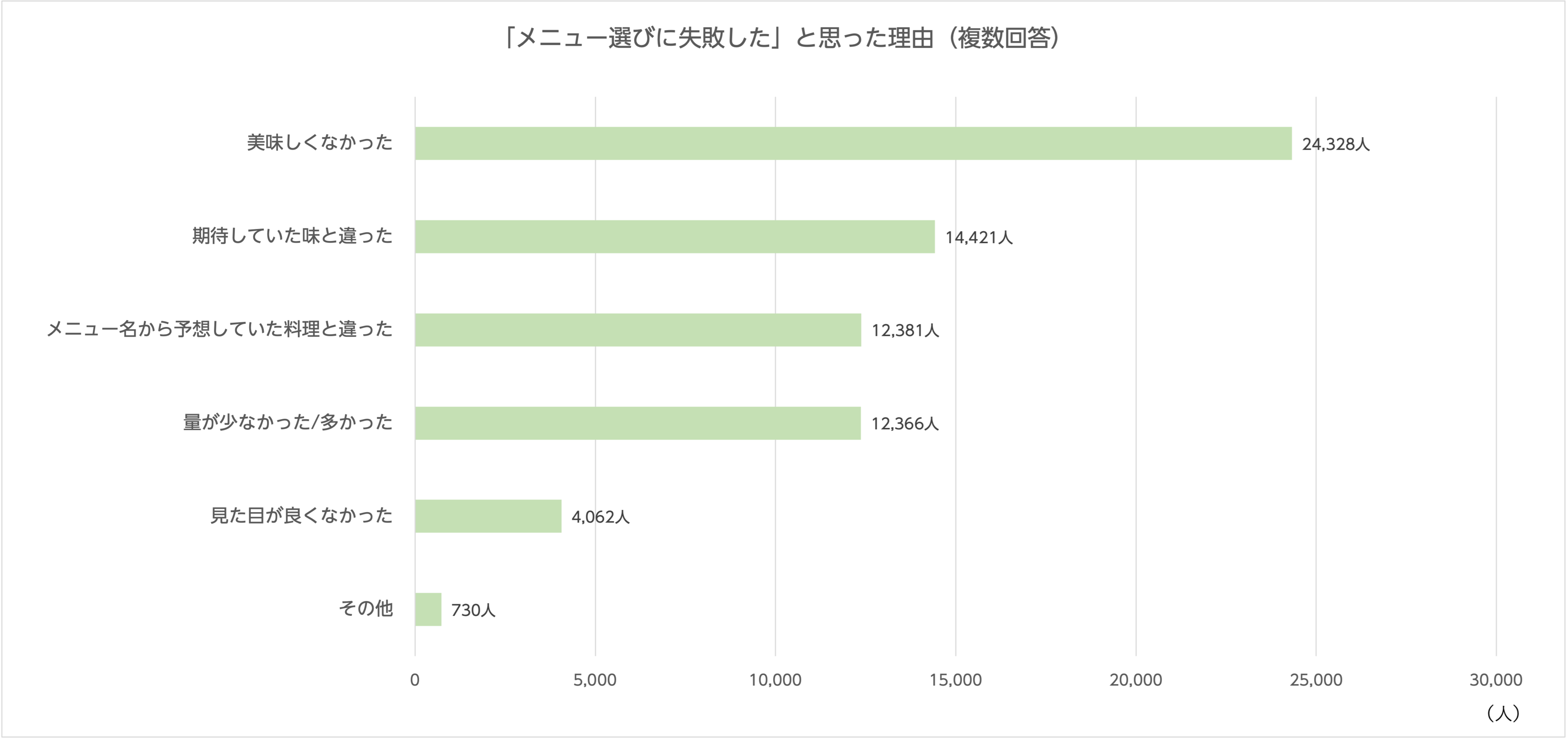 一方で、メニュー選びの失敗理由で「見た目」と回答した人は他の回答に比べると3分の1以下と、「見た目」が失敗の原因と感じるケースは比較的少ないといえそうです。