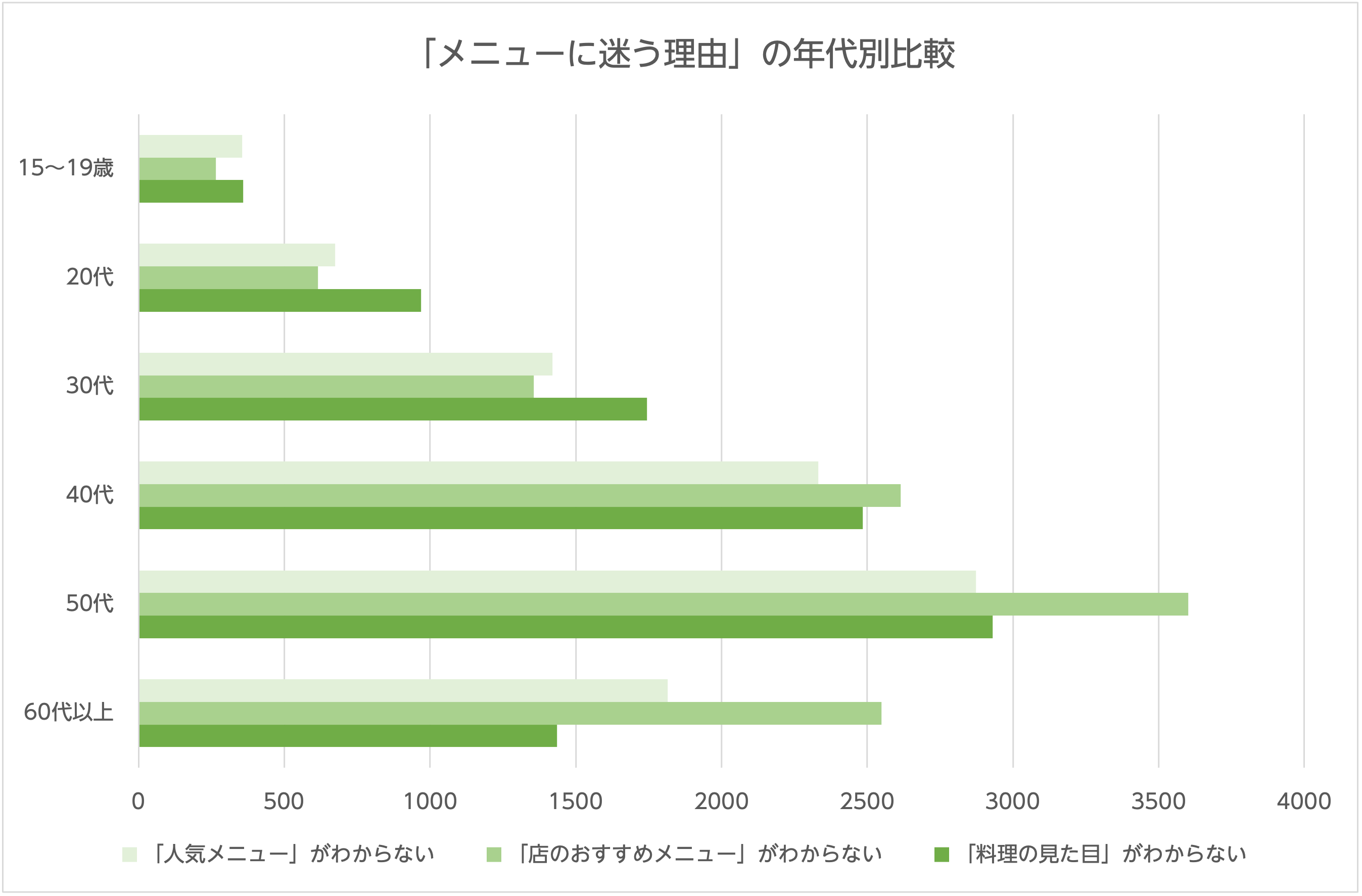 この3つの選択肢に絞った際、10〜30代まででは「料理の見た目がわからない」と回答した人が最も多く、次いで「人気メニューがわからない」、最も少なかったのが「店のおすすめメニューがわからない」という結果になりました。