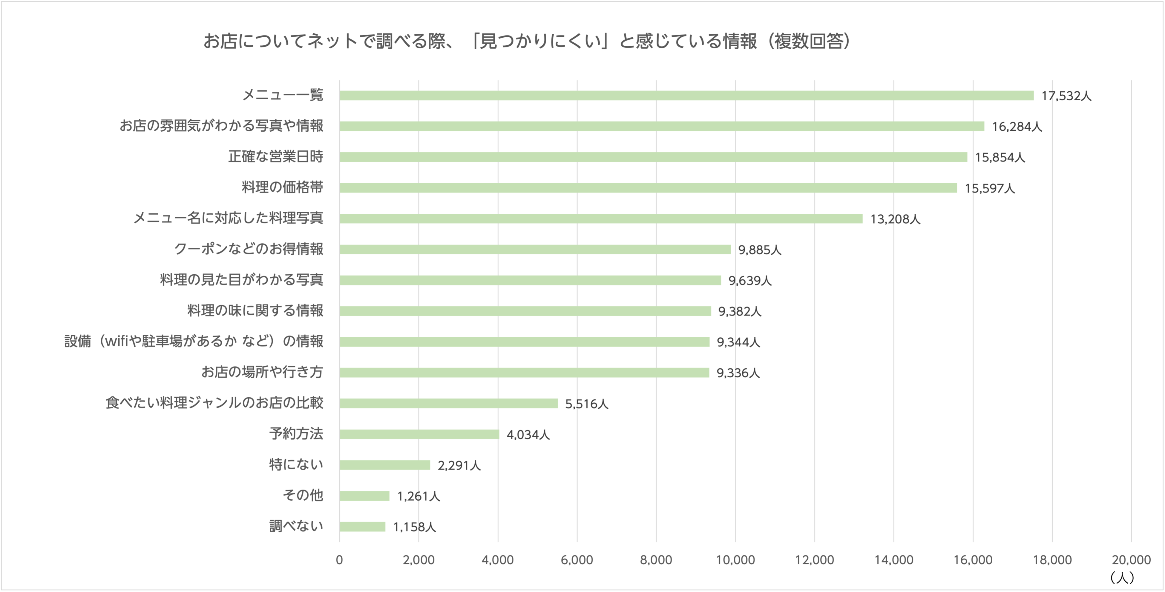 最も「見つかりにくい」と感じているのは「メニュー一覧」となり、次いで「お店の雰囲気がわかる写真や情報」「正確な営業日時」といった結果になりました。