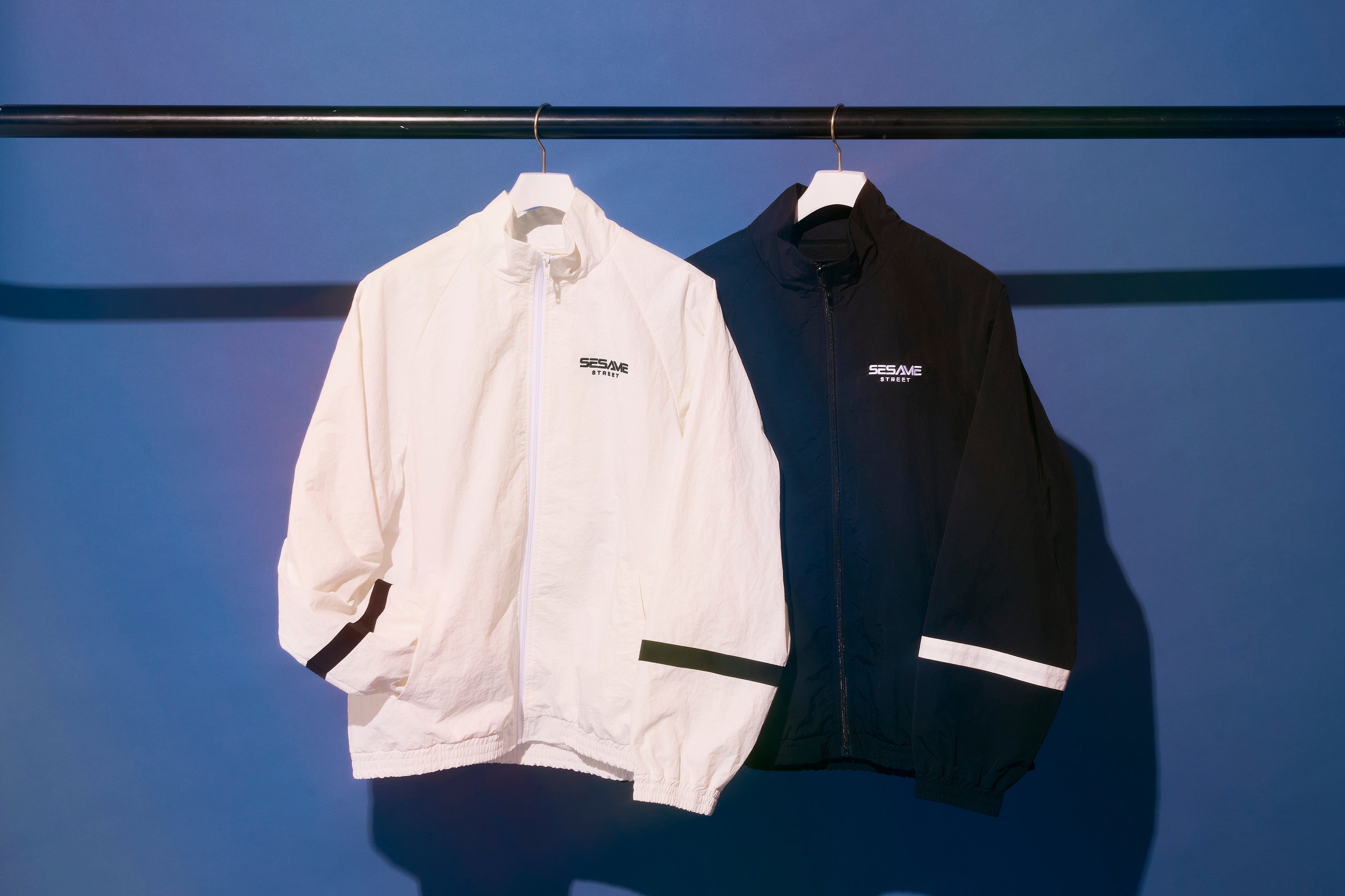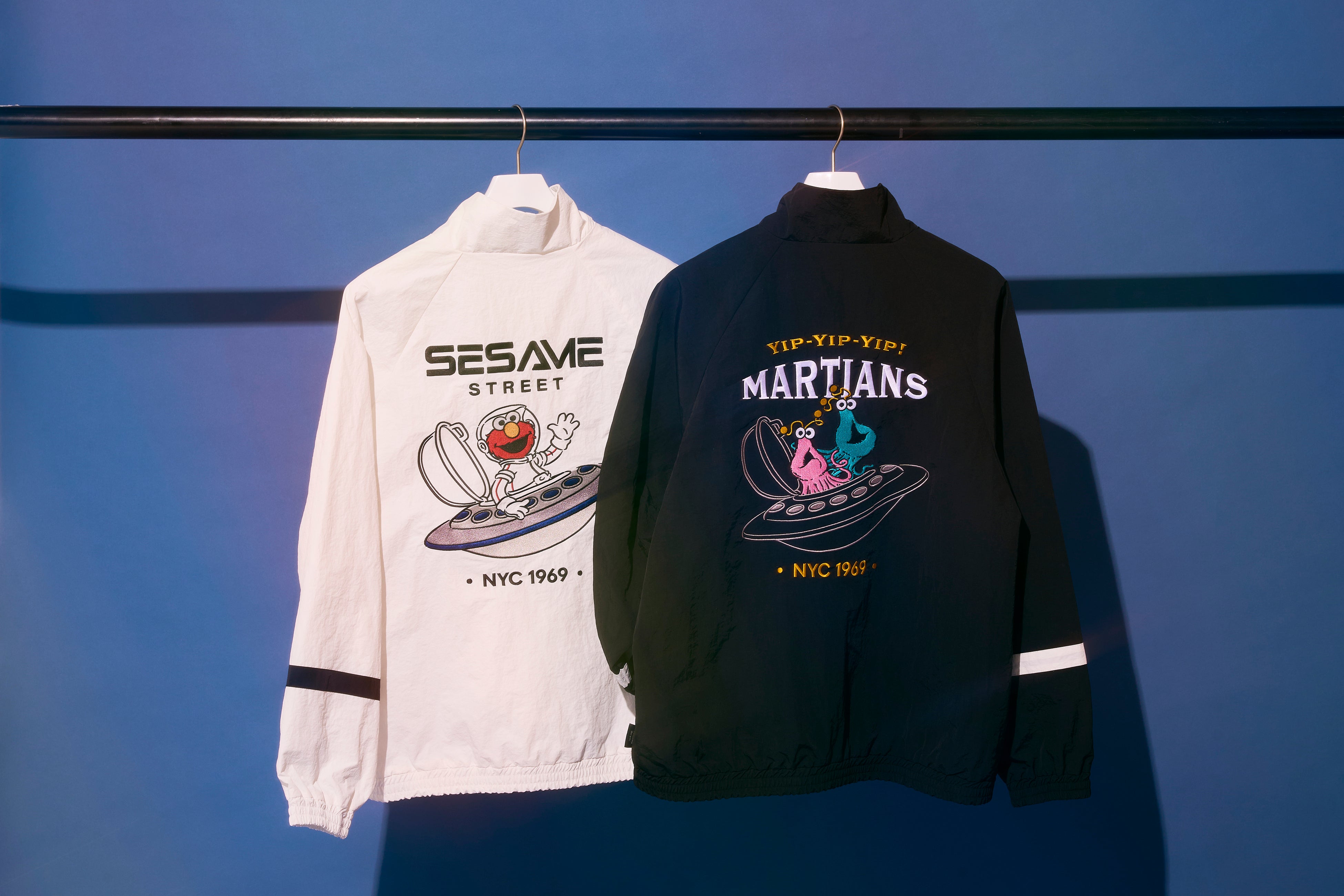 マットなナイロンワッシャー素材を使用した、軽量でさらりと羽織れるトラックジャケット。背中には宇宙を旅するエルモとイップイップを大胆に刺繍であしらい、存在感のあるデザインに仕上げました。袖口にはラインテープを施し、カジュアルながらも洗練された印象をプラス。