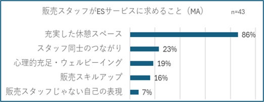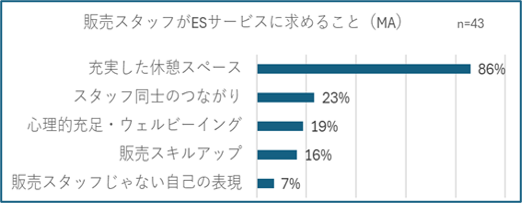 2026年2月に実施したアンケート調査では、販売スタッフがESサービスに求めることとして最も多かったのは「充実した休憩スペース」、次いで「スタッフ同士のつながり」「心理的充足・ウェルビーイング」「販売スキルアップ」という結果でした。少数ながら「販売スタッフではない自己の表現」という回答もあり、仕事以外の一面を出し合えるような機会をつくることも、これからの休憩スペースの役割ではないかと考えています。