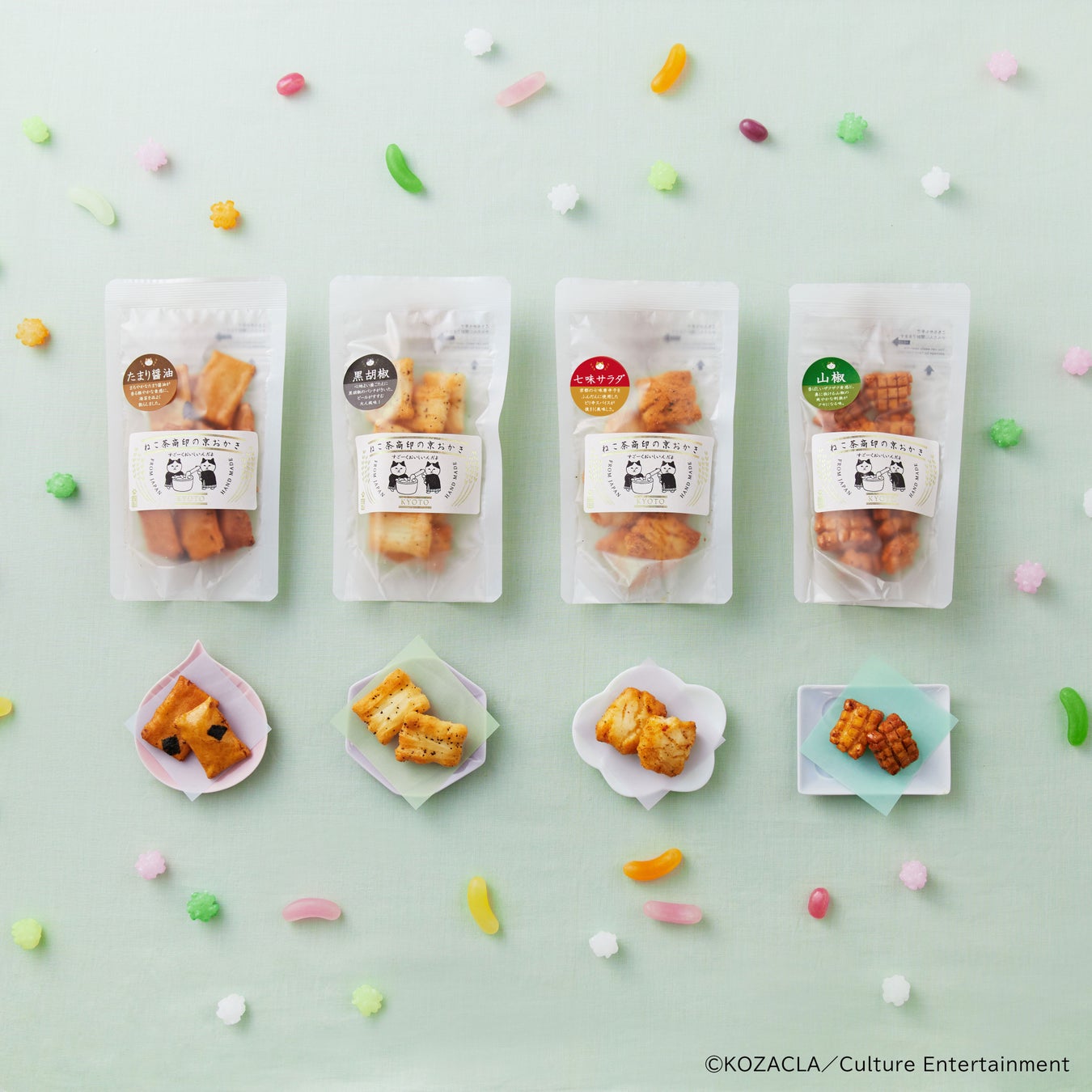 カルチュア・エンタテインメント株式会社より、素材からこだわりぬいた最高級のおかき「ねこ茶商印の京おかき」が登場。