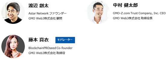 2022年6月、Web3に特化したCVC(コーポレートベンチャーキャピタル)であるGMO Web3株式会社の設立が発表され、取締役の一人に日本円ステーブルコイン「GYEN」を開発・運用するGMO-Z.com Trust Company, Inc. CEO 中村健太郎が就任。9月にはBlockchainPROseed Co-founderでブロックチェーン領域の普及活動も積極的に行う藤本真衣氏が取締役に、さらに日本発のパブリックブロックチェーンAstar Networkファウンダーで、STAKE TECHNOLOGIES Pte Ltd CEO渡辺創太氏が顧問に就任しました。渡辺氏はシンガポール、藤本氏はスイス、中村は米国と、Web3領域の中心で活躍する3人。グローバルチームを牽引する上での苦労やナレッジをはじめ、世界の視点から日本が抱える課題やこれからの展望など、GMO Web3社プロジェクトの話も交えて、お話しいただきます。