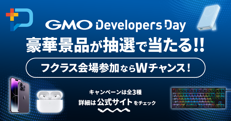 ■本キャンペーンに関する注意事項:本キャンペーンはGMOインターネットグループ株式会社による提供です。キャンペーンに関するすべてのお問い合わせは、GMO Developers Day運営事務局(devrel@gmo.jp)までお願いいたします。