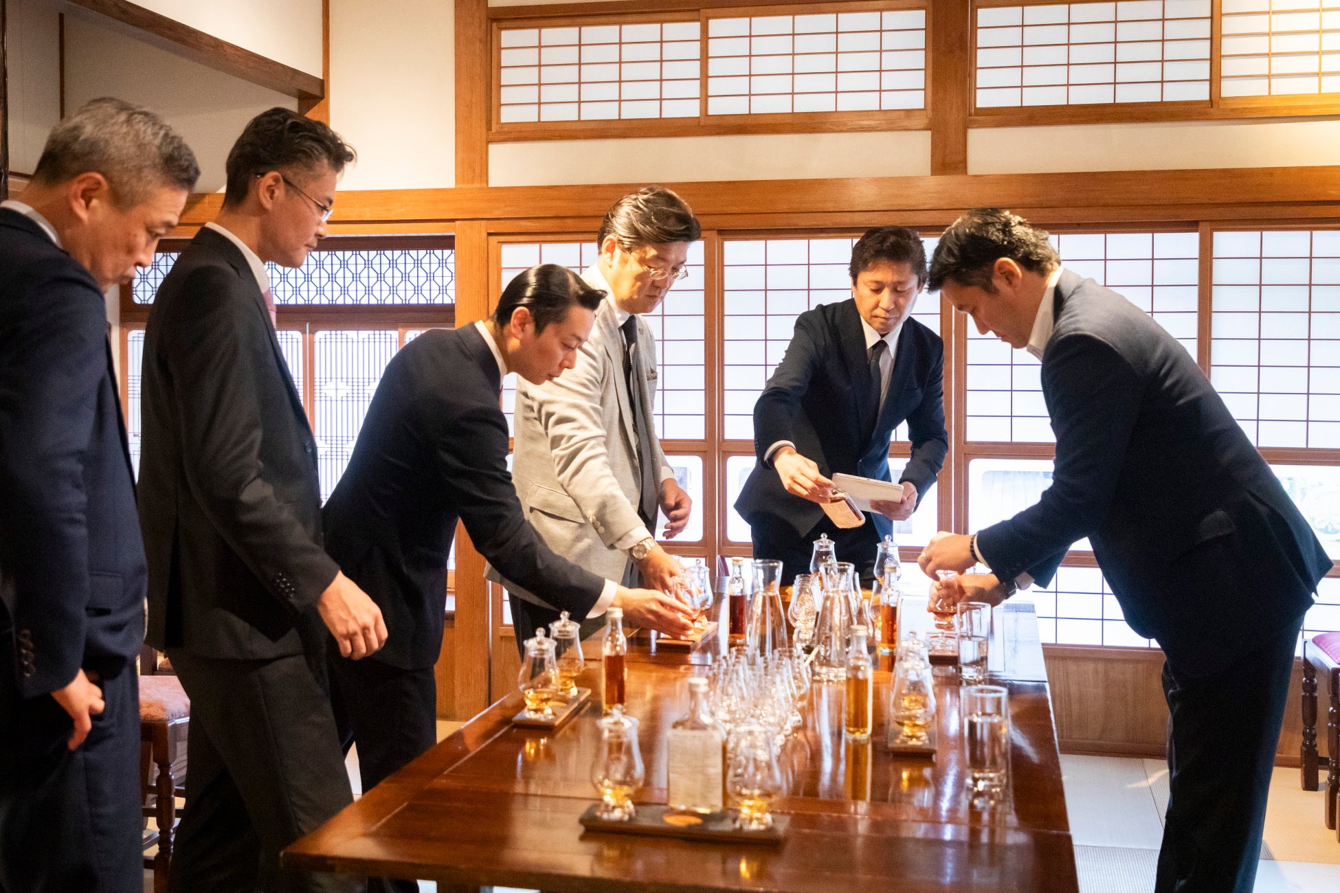 第一弾オリジナルウイスキーの選定にも立ち合った吉田茂樹(写真左。BELLUSTAR TOKYO, A Pan Pacific Hotel ビバレッジディレクター)と共にテイスティングをする様子/マルス津貫蒸溜所にて