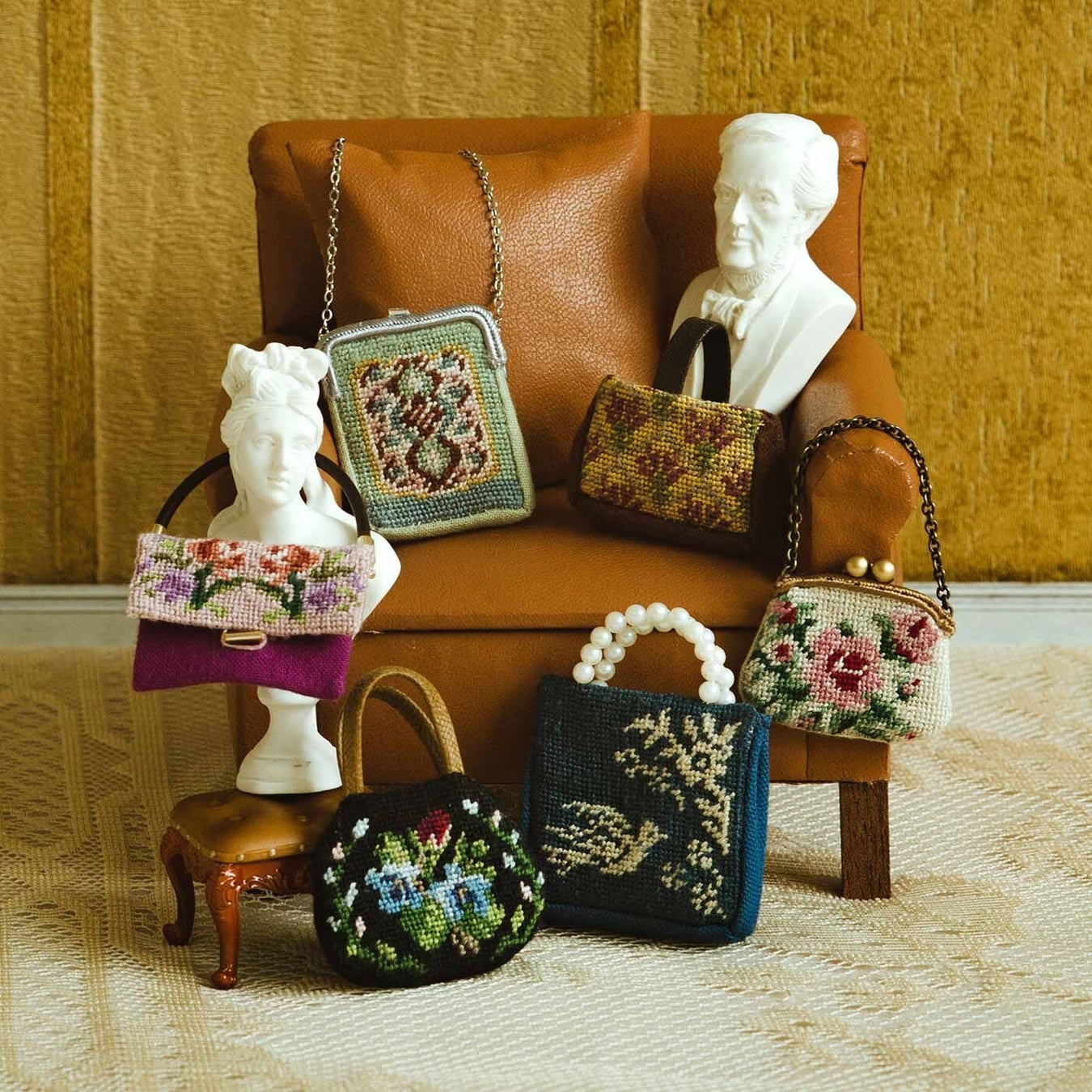 絵画のように美しく、緻密な刺しゅう「プチポワン」の技法を使った装飾性の高いデザイン。本格的な行程と仕上がりが自慢の、全6種類のミニチュアバッグが作れます。