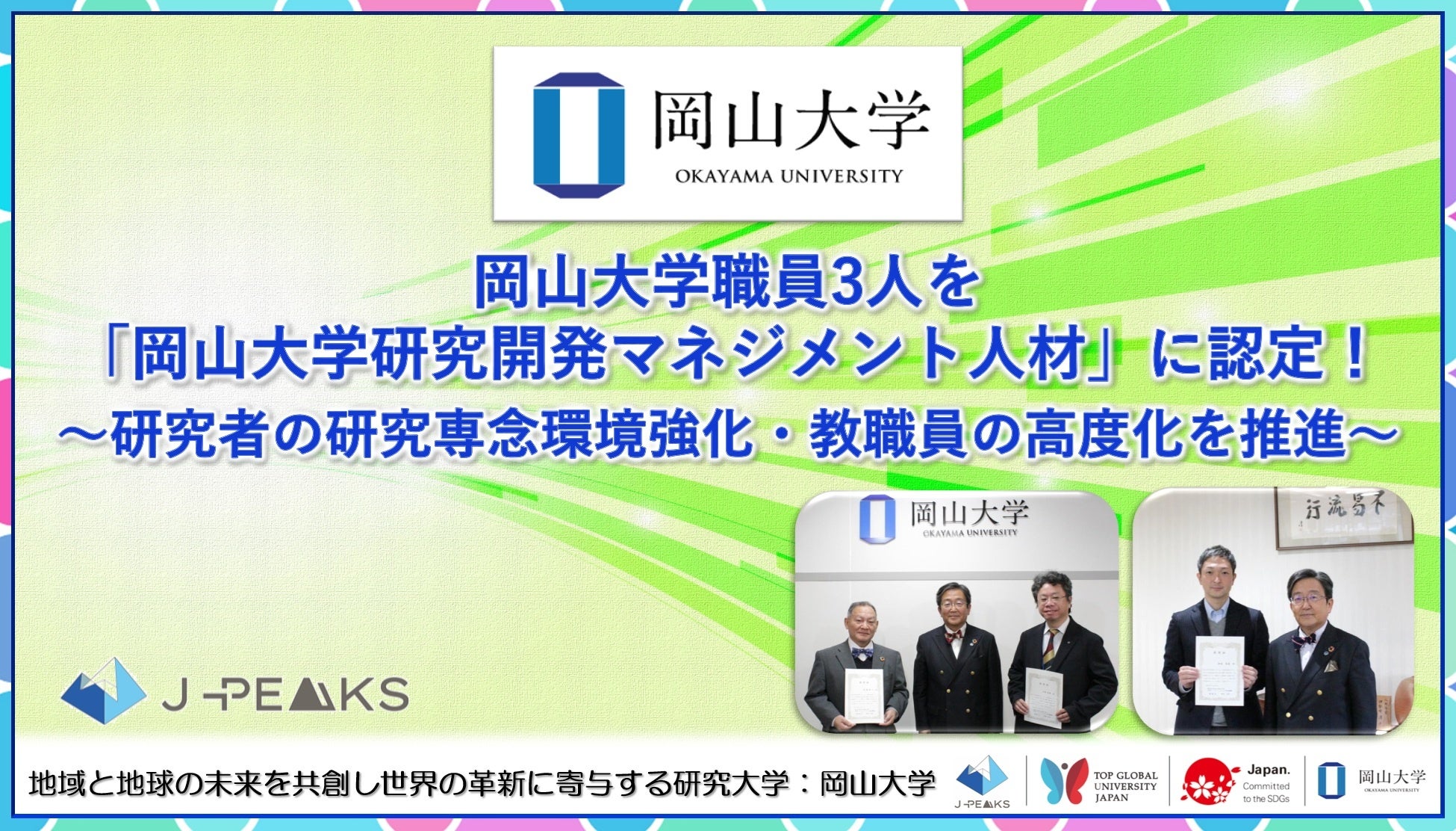 【岡山大学】岡山大学職員3人を「岡山大学研究開発マネジメント人材」に認定!~研究者の研究専念環境強化・教職員の高度化を推進~