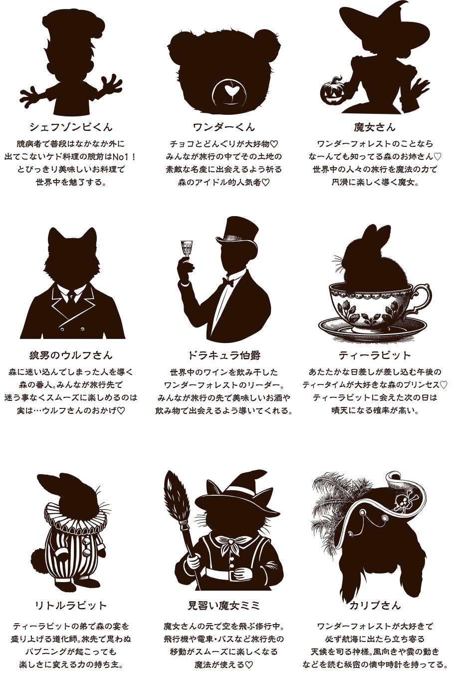 店内には、臆病だけど腕利きのシェフゾンビや、森のアイドルのワンダーくん、案内役の魔女さん、迷い人を導く狼男のウルフさんなど、個性豊かな住人たちが暮らしています。彼らはこの夜、ホテルスタッフに憑依して現れたり、ブッフェ台に設置したランタンや装飾にそっと隠れています。お客さまには、そんな不思議な住人たちを見つけ出す“森の住人さがし”クイズをご用意します。