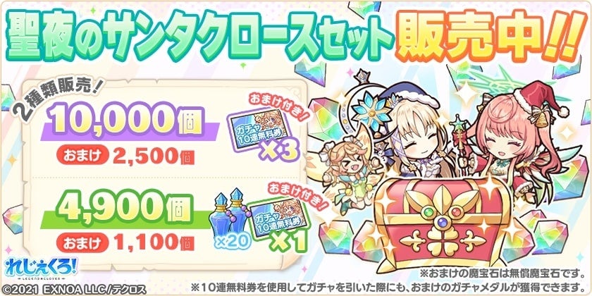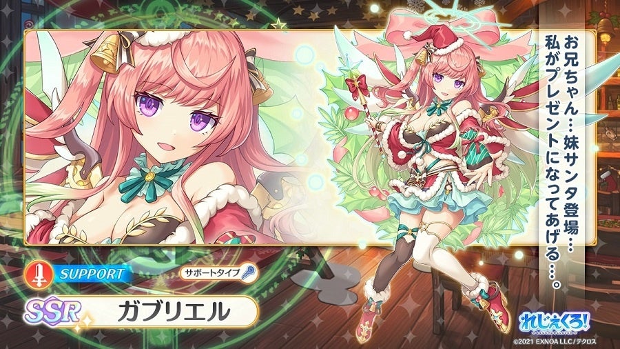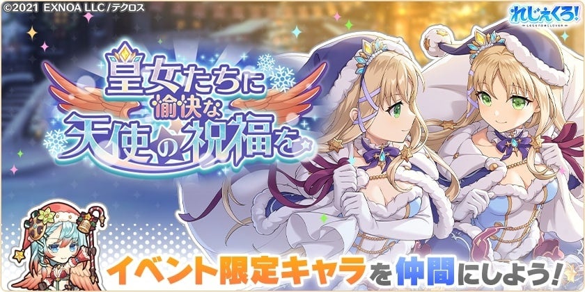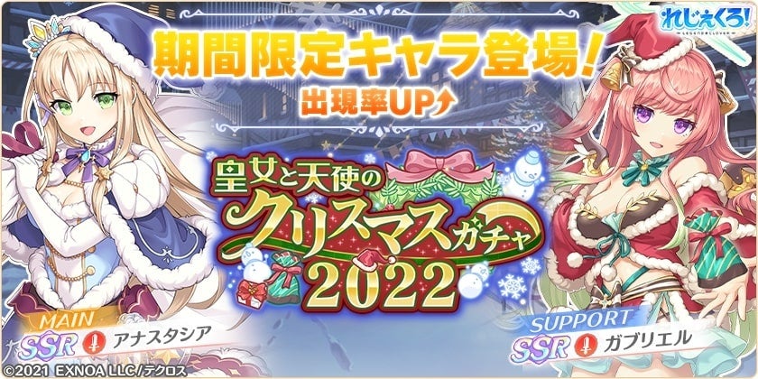 合同会社EXNOA(本社:東京都港区、CEO:村中 悠介、URL:https://games.dmm.com/)が運営するDMM GAMESにおいて、真の英雄となる王道ファンタジー『れじぇくろ!~レジェンド・クローバー~』(https://www.legend-clover.net/)は、期間限定キャラとして、キュートなサンタクロース衣装を身にまとった「アナスタシア」と「ガブリエル」が新登場したことを発表した。さらにイベント限定のクリスマス「ウリエル」が手に入るクリスマスイベントも開催している。