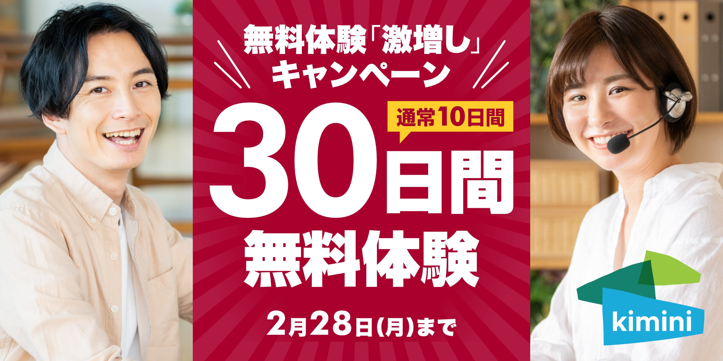 只今、Kiminiでは、一番人気のプランであるスタンダードプランの「10日間」の無料体験を「30日間」に増量するキャンペーンを実施しております。