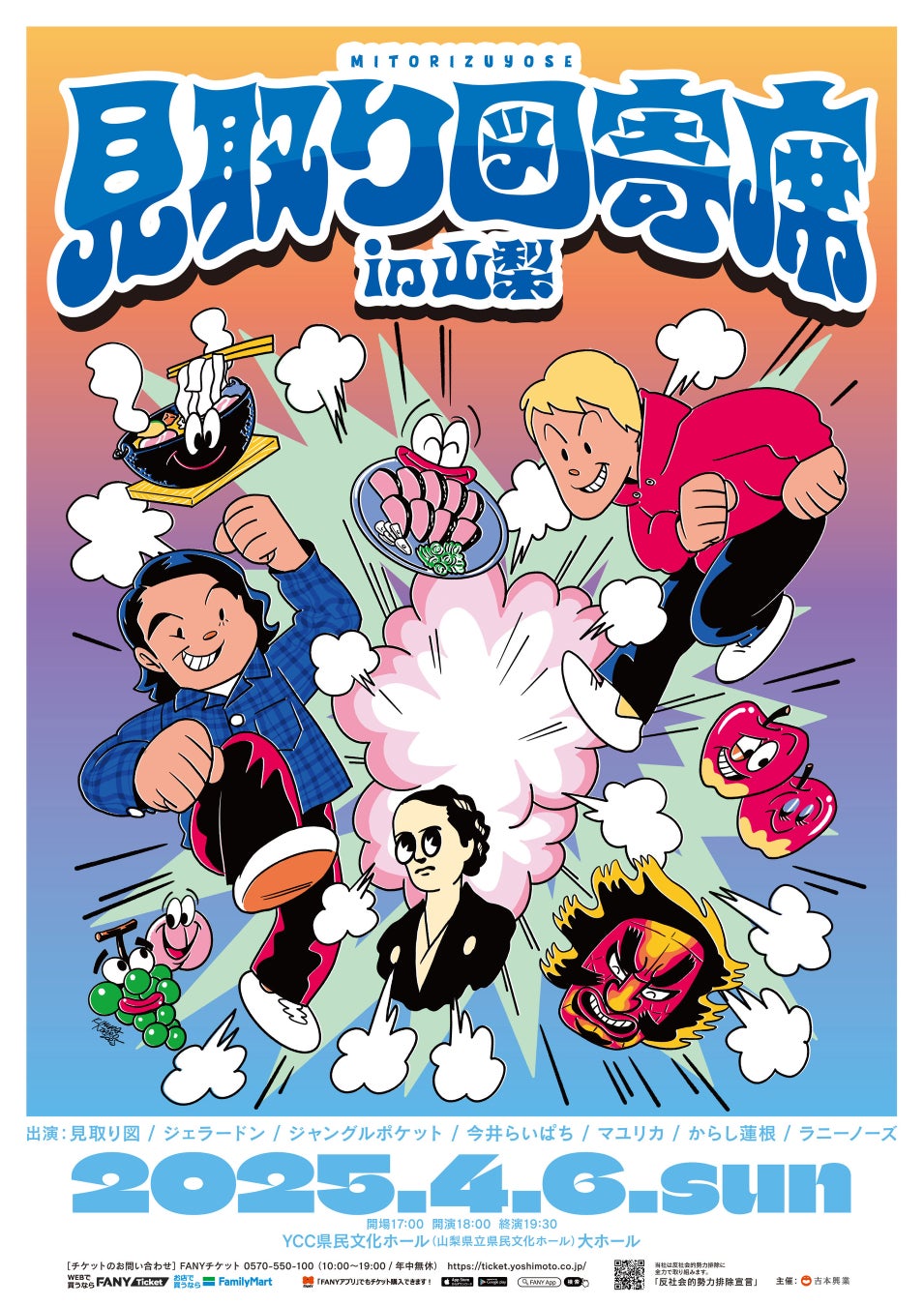 見取り図が厳選したメンバーたちと一緒にネタとコーナーでお送りする「見取り図寄席」を4月6日(日)の山梨公演を皮切りに、7月13日(日)に青森、10月12日(日)に高知と3か所にて開催することが決定いたしました。山梨公演では、見取り図のほかに、ジェラードン・ジャングルポケット・今井らいぱち・マユリカ・からしレンコン・ラニーノーズと豪華なメンバーがゲストとして出演いたします。