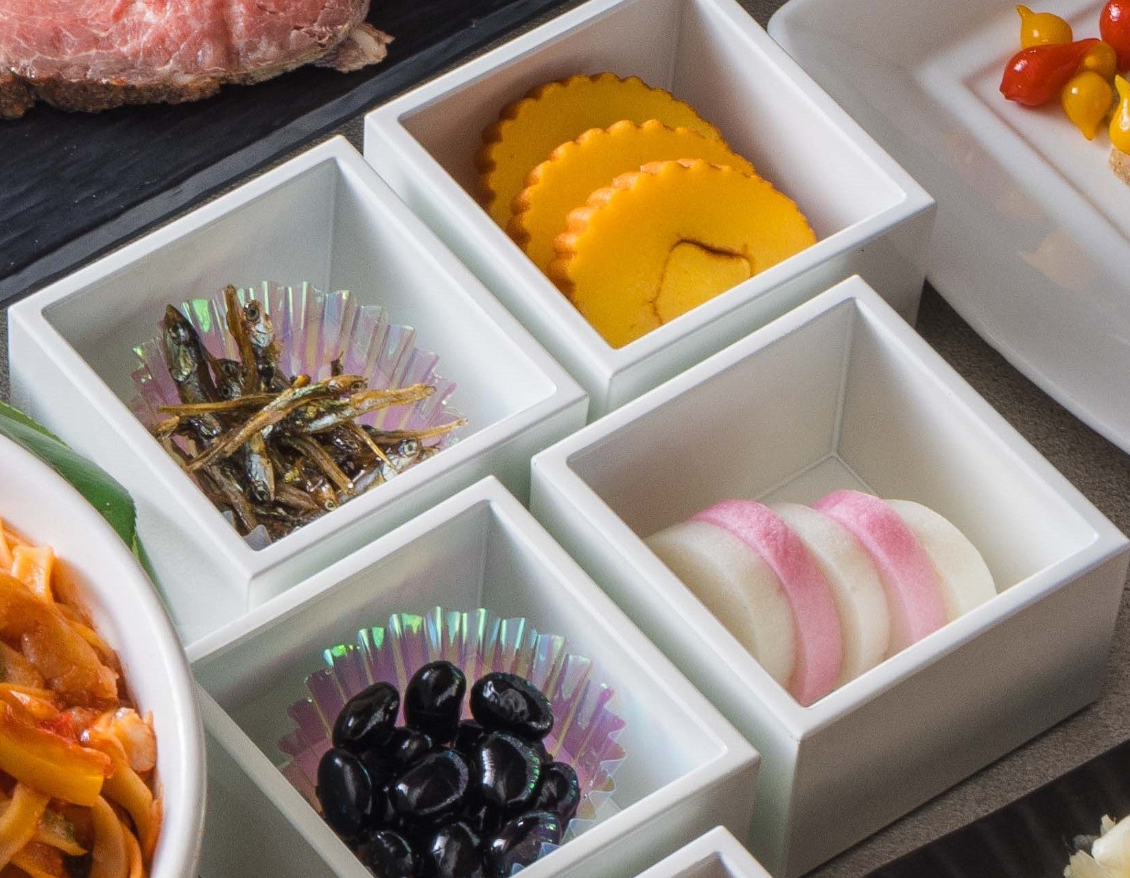 縁起のいい「黒豆」や「紅白かまぼこ」など、お正月に欠かせないおせち料理をご用意。