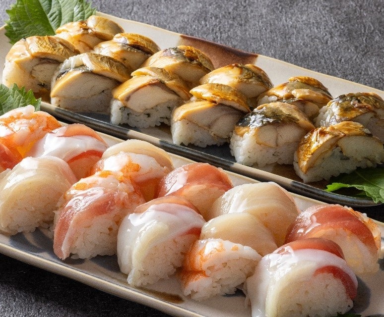 芳醇でまろやかな味わいの赤酢を用いたシャリの上に、マグロ・ヤリイカ・エビ・サーモン、焼きサバをのせて、棒状に仕上げた「棒鮨」をお楽しみください。