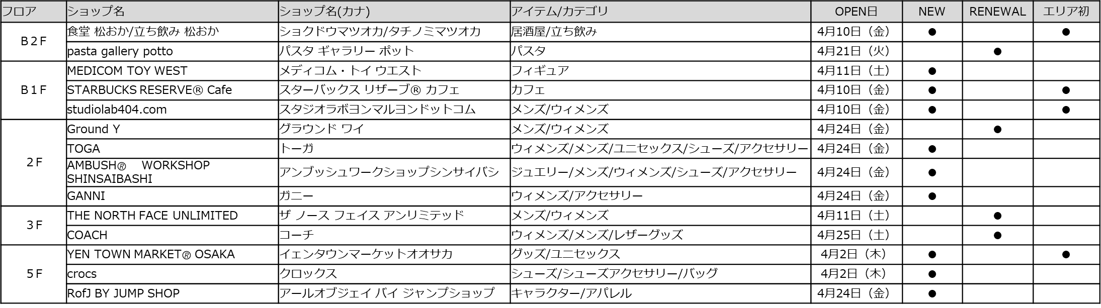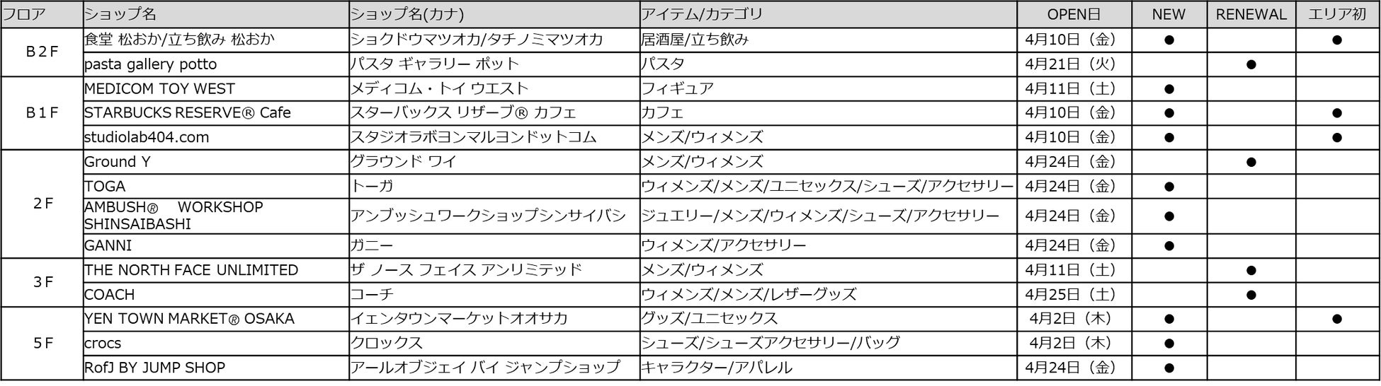 ●心斎橋PARCO 2026年NEW&RENEWAL SHOP一覧