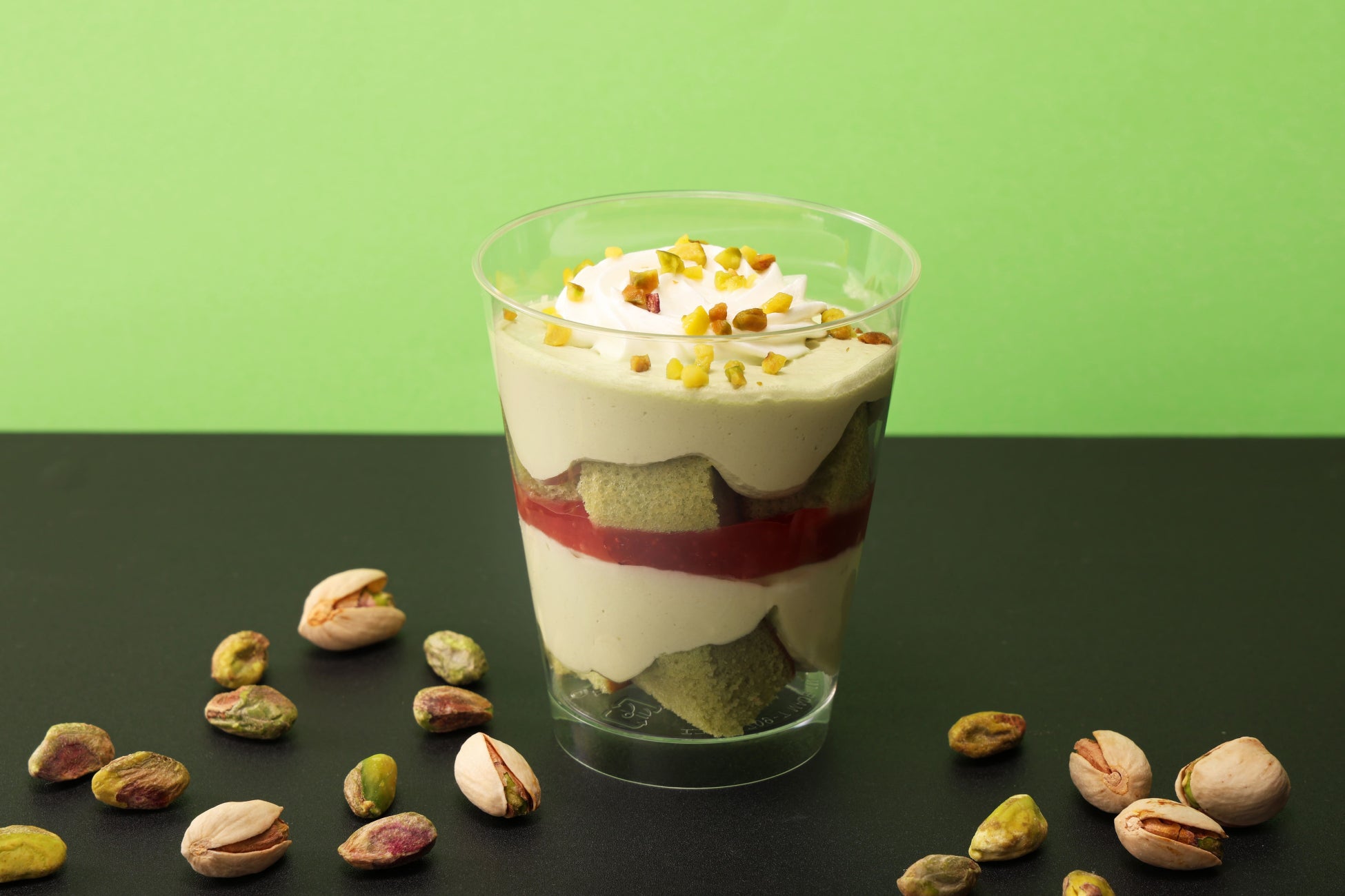 濃厚なピスタチオクリームを楽しめるパフェです。ピスタチオ風味のシフォンケーキ、ピスタチオクリーム、ベリーソースを重ね、その上にホイップクリームをのせました。食感のアクセントとして、砕いたピスタチオをトッピングしました。