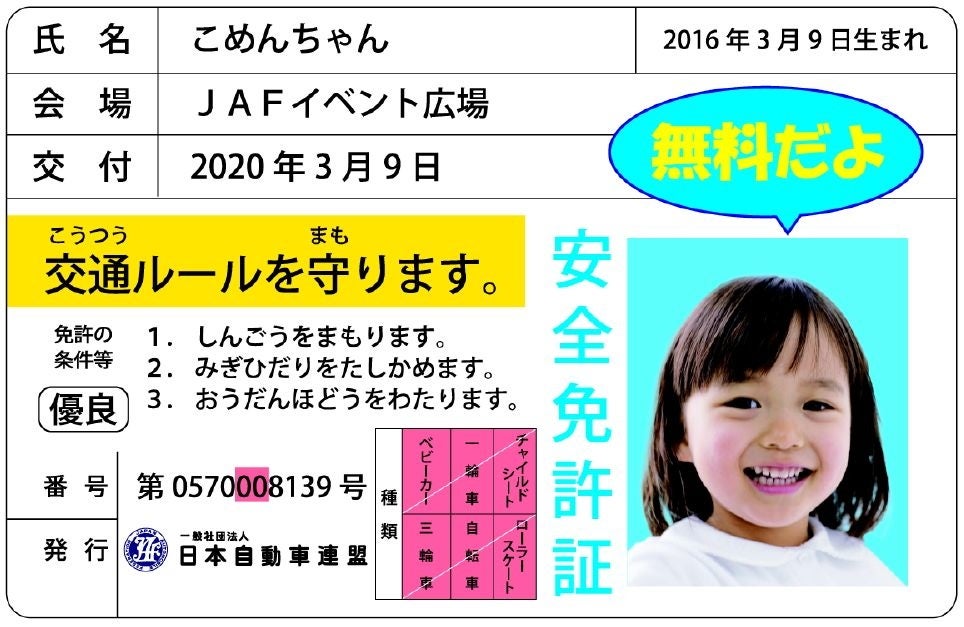 今回のイベントでは、交通安全のクイズに答えるともらえる免許証そっくりの顔写真入りオリジナルカード「子ども安全免許証」の発行、JAFカラーに塗られたペダルカーなどのコーナーを体験しながら交通安全に関する正しい知識を身につけ、安全意識を高めていただくことを目的にブース出展いたします。