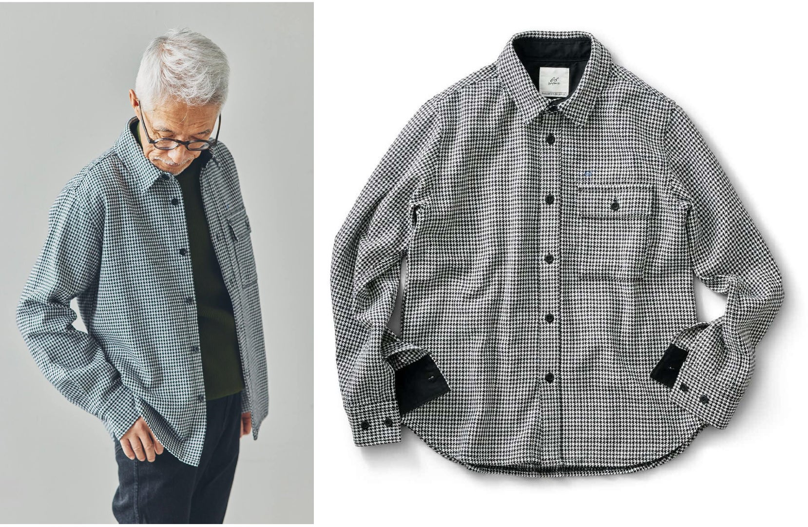 しっかりとした厚みとやわらかさを兼ね備えた、極太糸で織られたシャツとキュロパンです。モノトーンの千鳥模様が無地のように見えるため、さまざまなスタイルに取り入れやすいデザインです。シャツは羽織りものとしても活用できます。