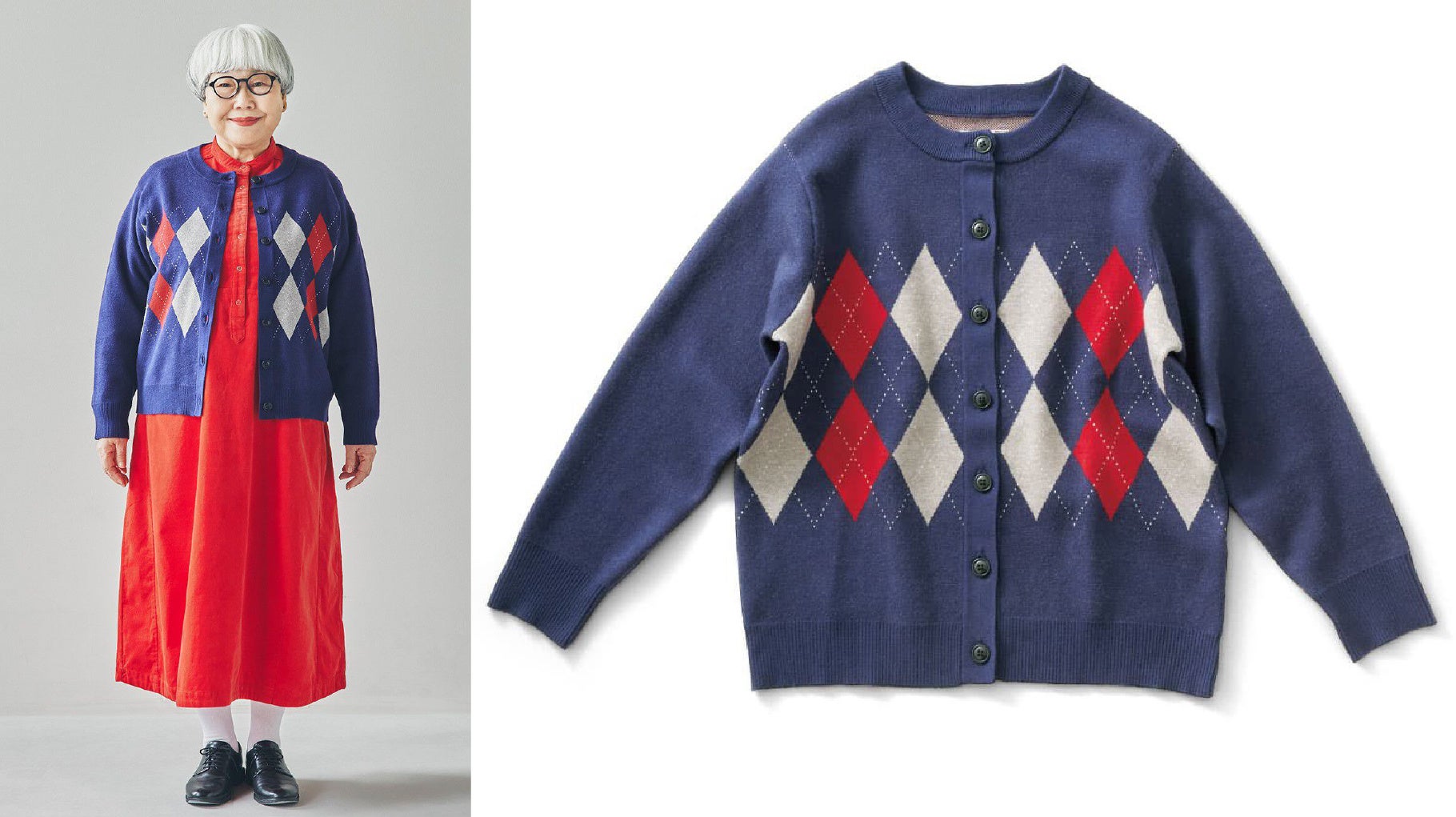 程よいコンパクトさで、どんなスタイルにも合わせやすいカーディガンです。アイビールックらしいアーガイル模様が両胸に編み込まれており、ダブルジャカードの二重編みによるしっかりとした質感が、日常使いにうれしいデザインです。