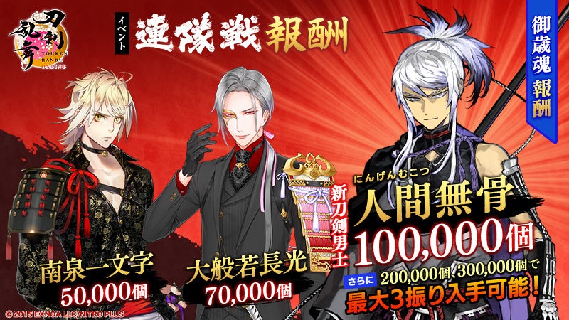 敵の撃破に応じて入手可能な「御歳魂(おとしだま)」を一定数集めることで、新刀剣男士「人間無骨(cv. 吉野裕行)」など様々な報酬が入手できます。