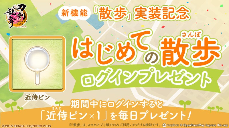 スマホアプリ版の新たな機能「散歩」の実装を記念して「はじめての散歩ログインプレゼント」を開催いたします。