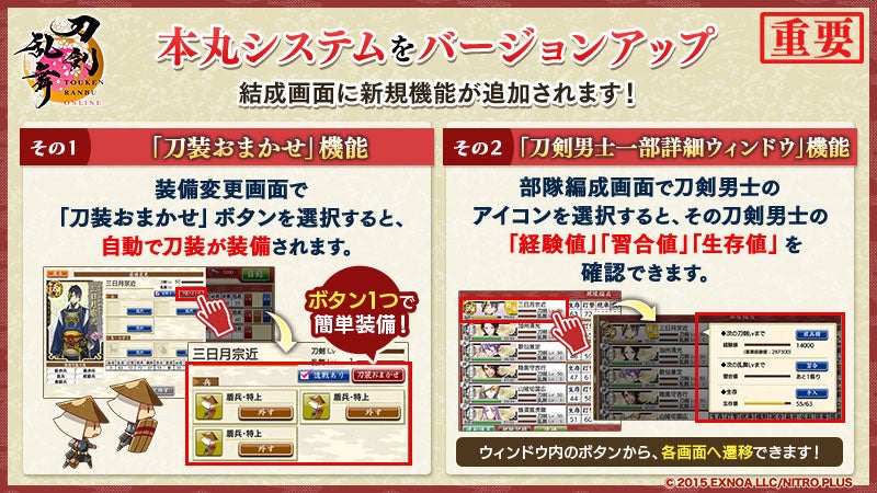 結成画面に刀剣男士に刀装を自動で装備できる「刀装おまかせ」機能と、刀剣男士の「経験値」「習合値」「生存値」を確認できる「刀剣男士一部詳細ウィンドウ」機能を追加いたしました。