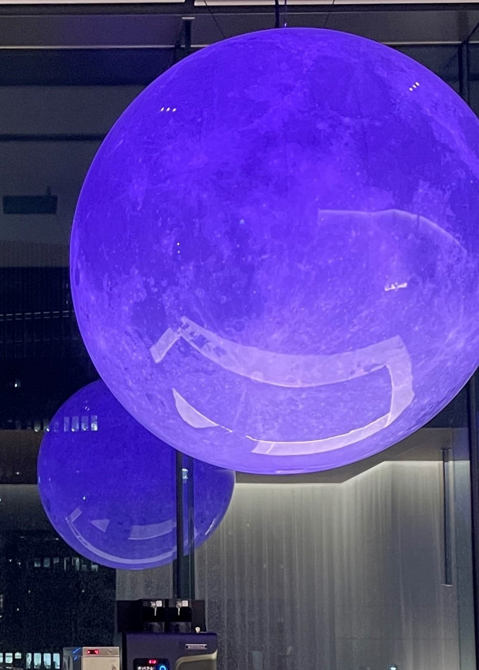 ・9Fロビーの月のオブジェを、メンバーカラーの「紫」に