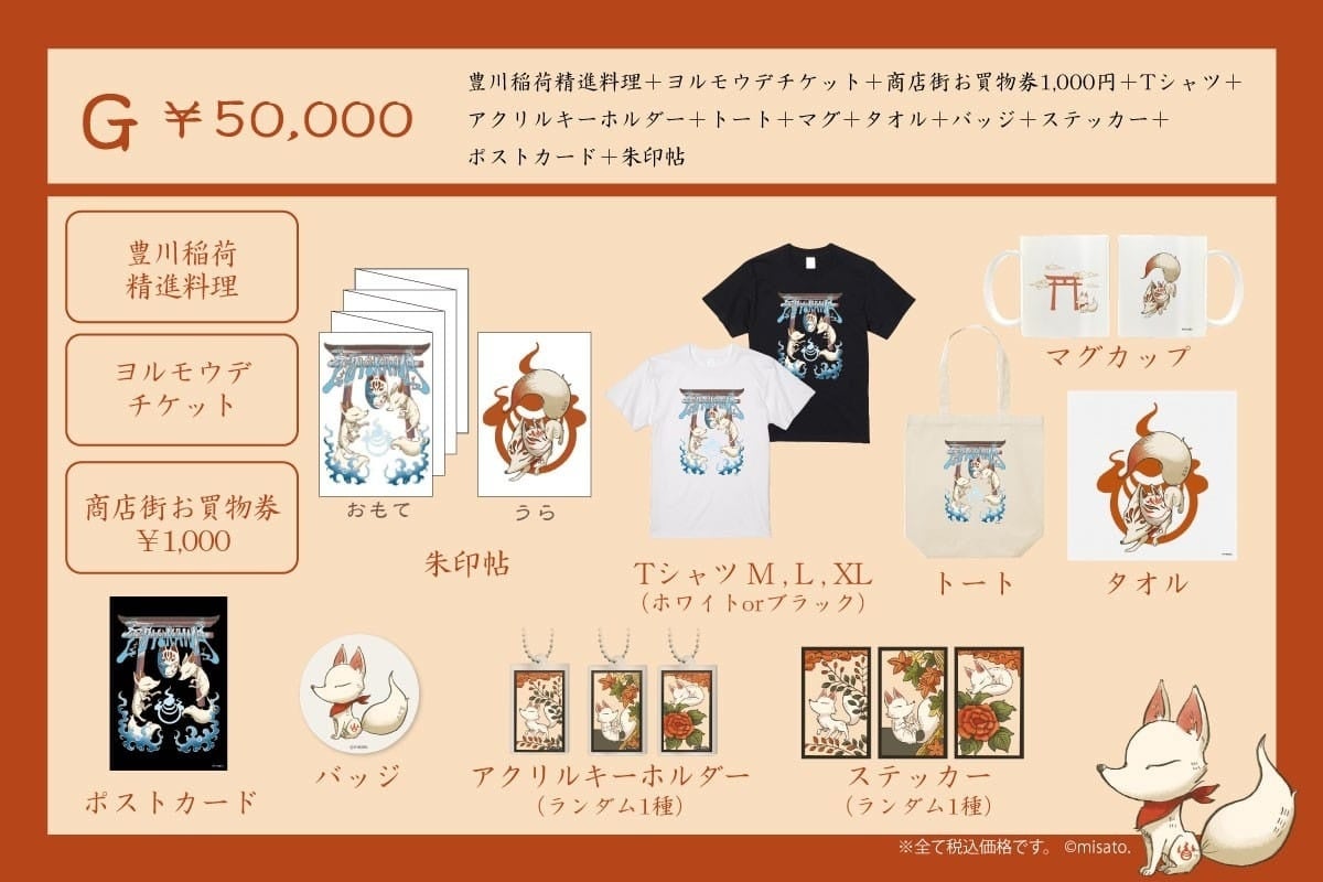 豊川稲荷ヨルモウデ参拝ペアチケット、商店街お買物券10,000円、Tシャツ(白黒M.L.XLからお選びください)・アクリルキーホルダーランダム1種・トートバッグ・マグカップ・ハンドタオル・バッジ・ステッカーランダム1種・ポストカード・朱印帖 のセットです。商店街で一日お楽しみ頂けるコースとなっております。