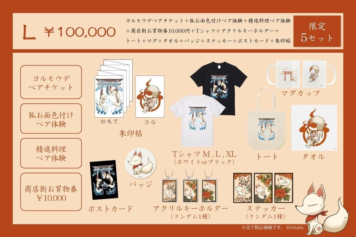 - L<限定5口> 狐お面ペア体験、精進料理ペア、ヨルモウデペアチケット、お買物券1万円分、雑貨セット 100,000円
