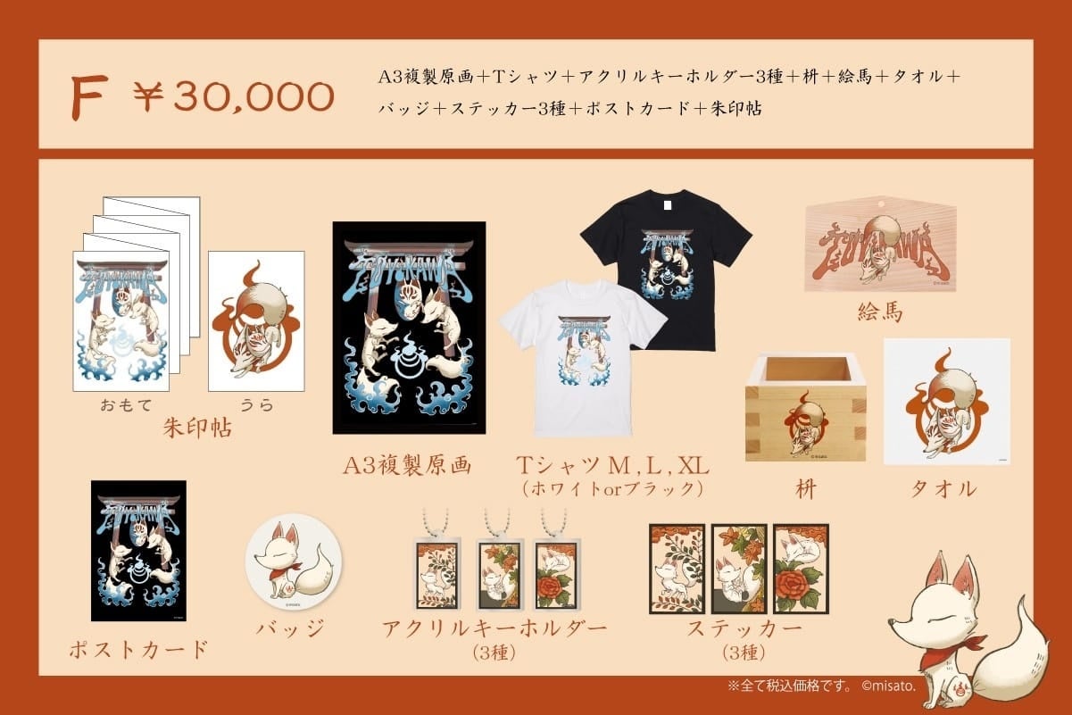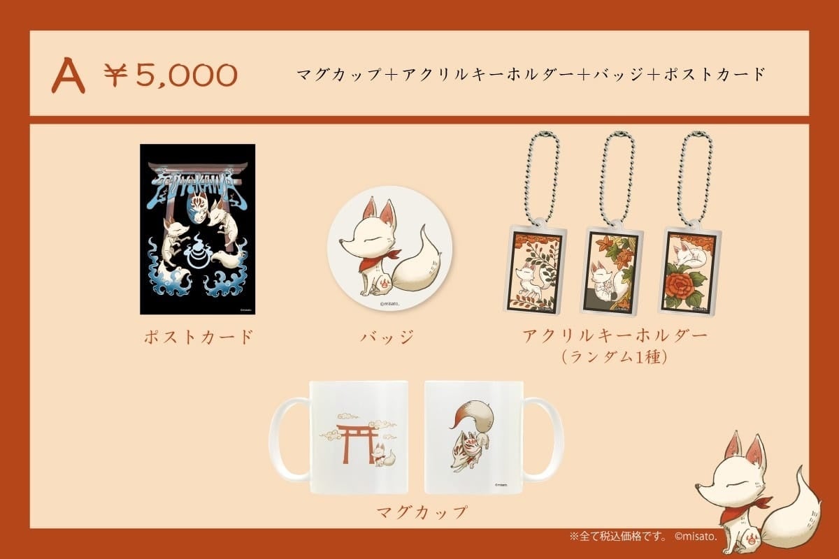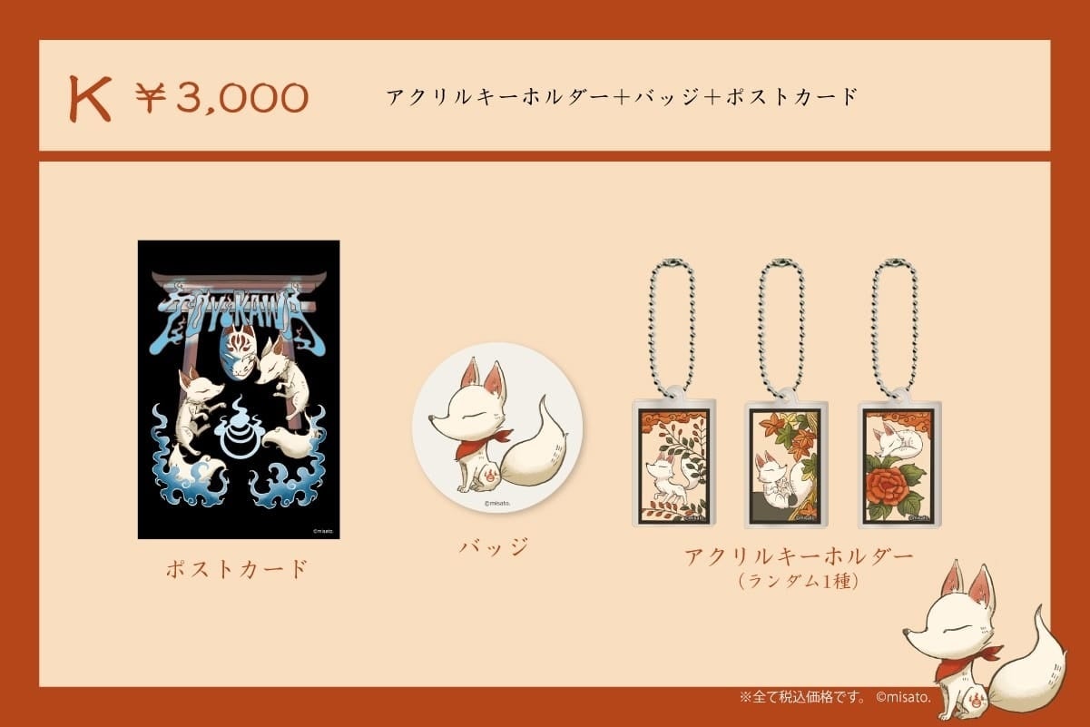 Tシャツ(白黒M.L.XLからお選びください)・アクリルキーホルダーランダム1種・トートバッグ・枡・ハンドタオル・バッジ・ステッカーランダム1種・ポストカード・朱印帖 のセットです。