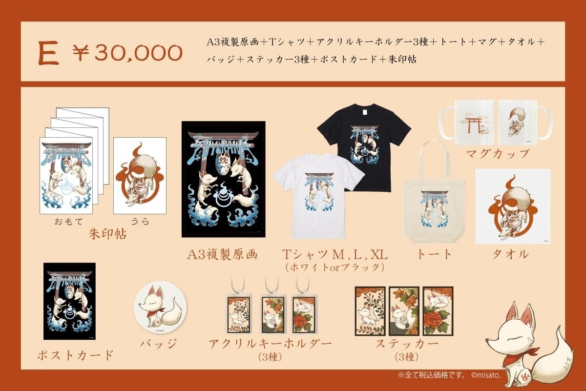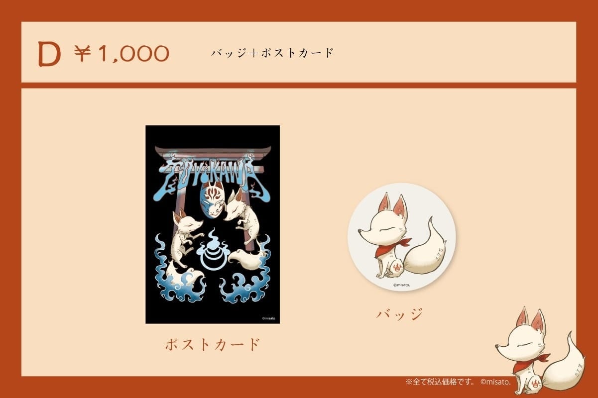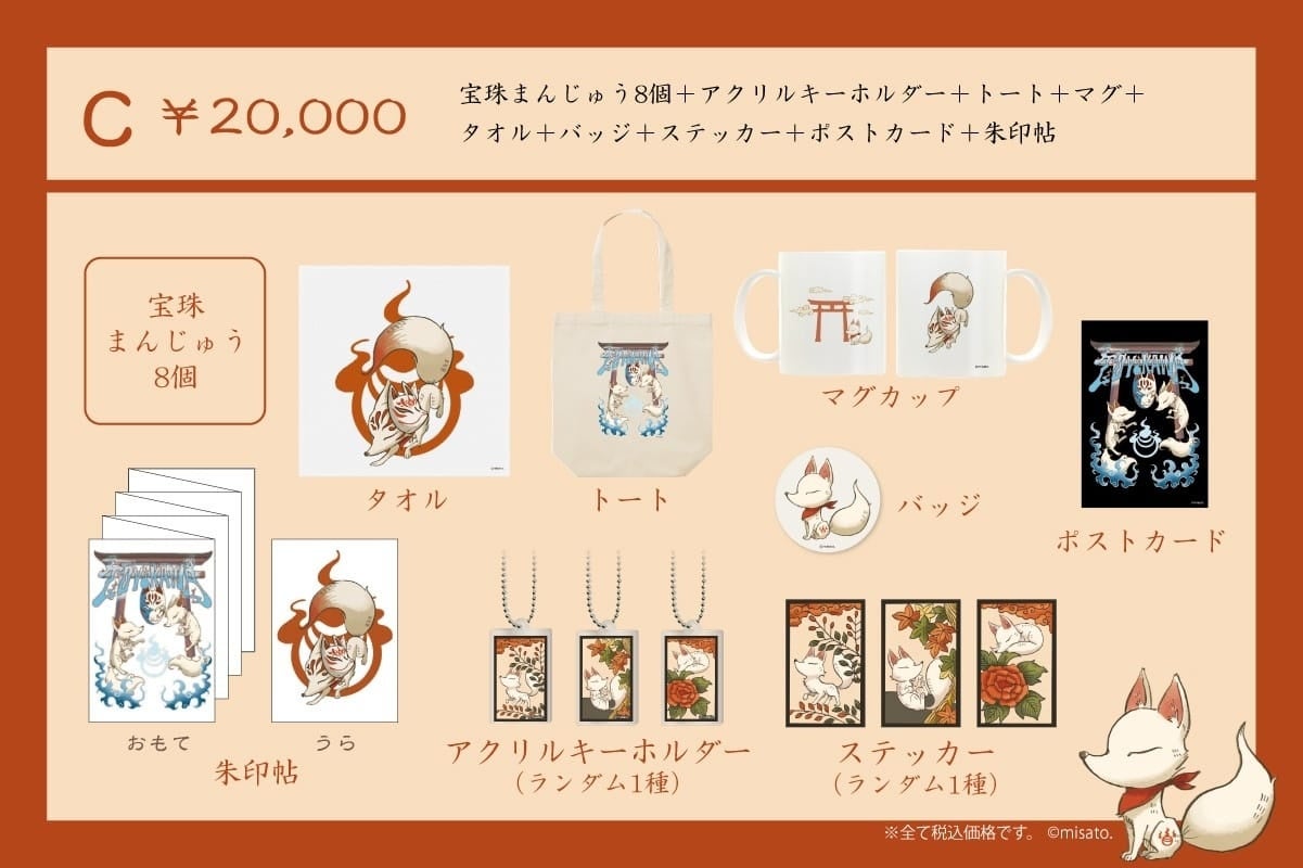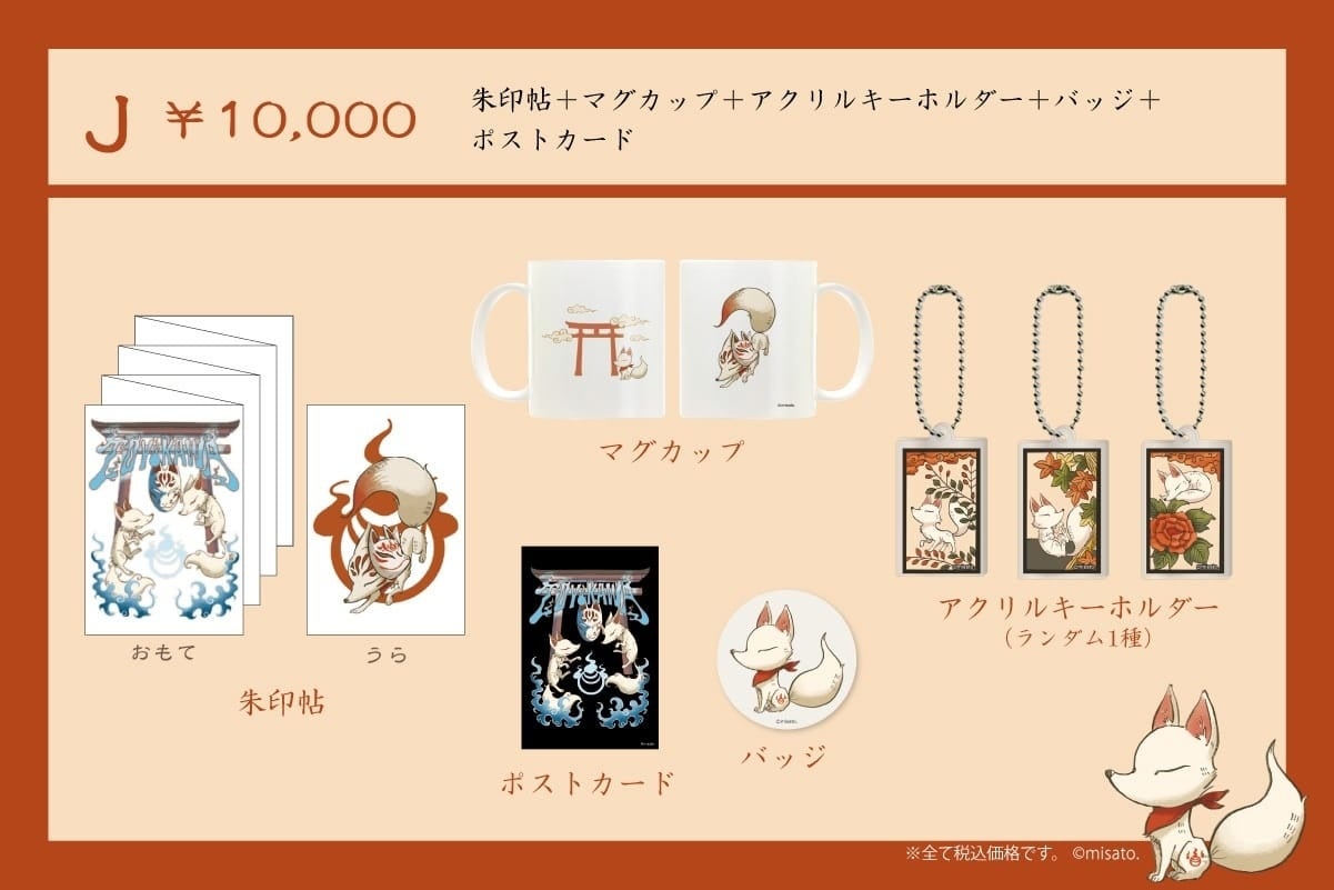 Tシャツ(白黒M.L.XLからお選びください)・アクリルキーホルダーランダム1種・トートバッグ・枡・ハンドタオル・バッジ・ステッカーランダム1種・ポストカード・朱印帖 のセットです。