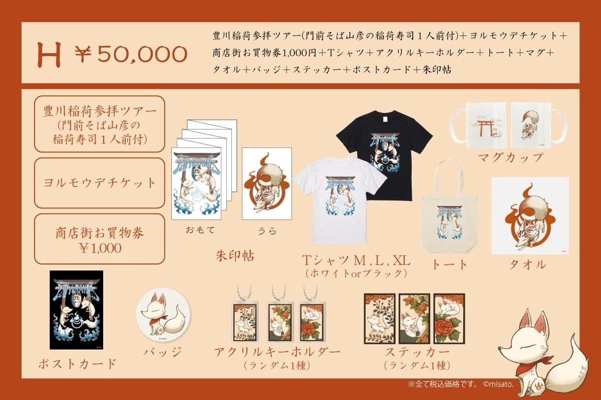 - H 豊川稲荷参拝ツアー体験とむすび茶屋の稲荷寿司1人前付 、ヨルモウデチケット、お買物券、雑貨セット 50,000円