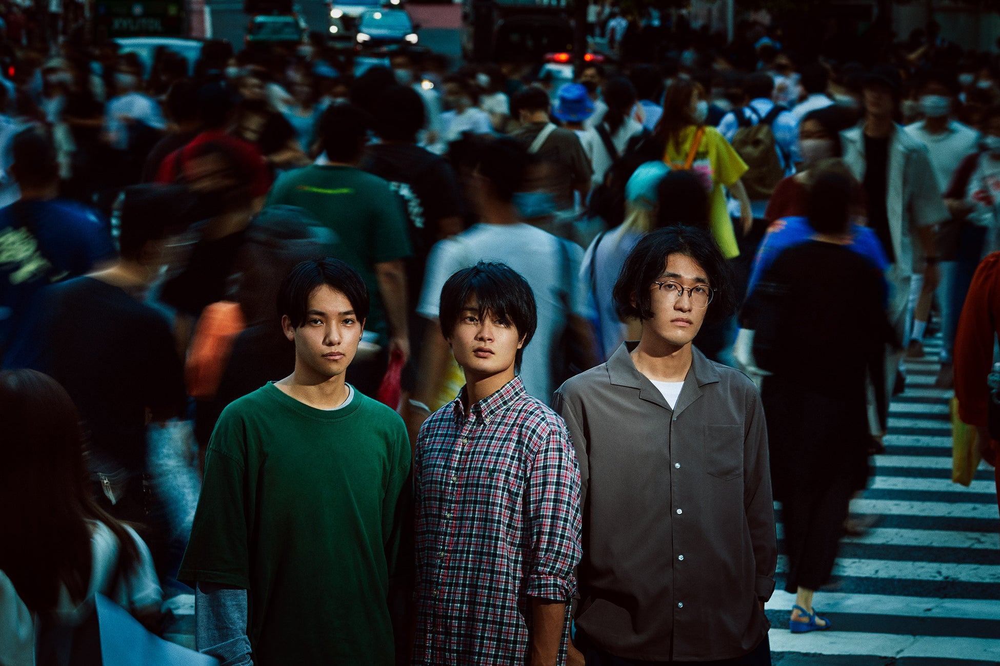 <写真左から、岡野創太(Dr&Perc&Cho) / 林龍佑(Gt&Vo) /  上遠野日向(Ba) >