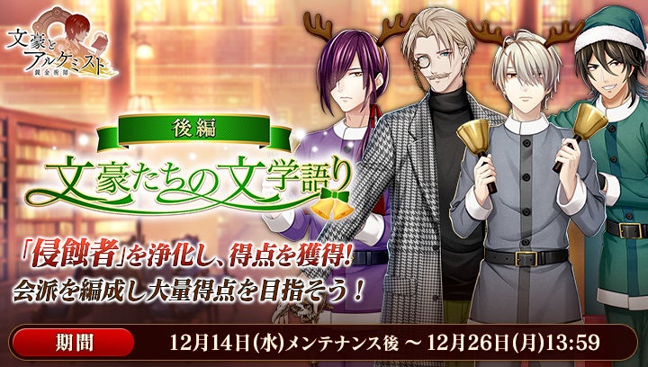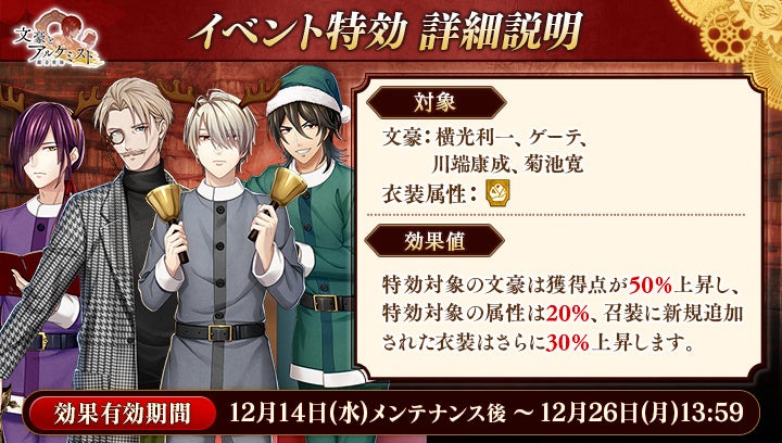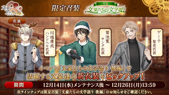 さらに、イベントと同時に開催される限定召装『文豪たちの文学語り 後編』にて新規追加された「ゲーテ」の〈聖夜衣装〉、「川端康成」の〈ハンドベル衣装〉、「菊池寛」の〈サンタ衣装〉を編成すると、得点の獲得率がそれぞれ30%上昇します。