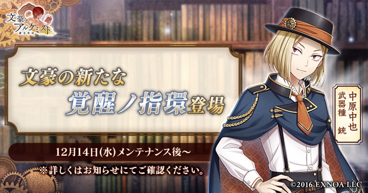 合同会社EXNOA(本社:東京都港区、CEO:村中 悠介、URL:https://games.dmm.com/)が運営するDMM GAMESは、12月14日(水)より、女性向け文豪転生シミュレーションゲーム「文豪とアルケミスト」において、中原中也の新たな「覚醒ノ指環」が登場いたしました。
