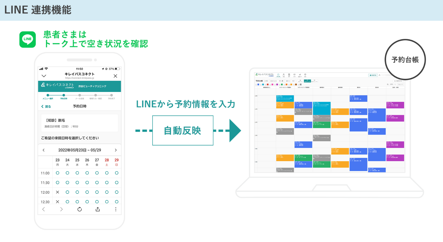 『LINE連携機能』では、クリニックのLINE公式アカウントの有効利用による集客率アップや、管理工数の削減を目的とし、シームレスな予約フローの構築や「キレイパスコネクト byGMO」の台帳機能への予約情報の自動登録を実現いたします。